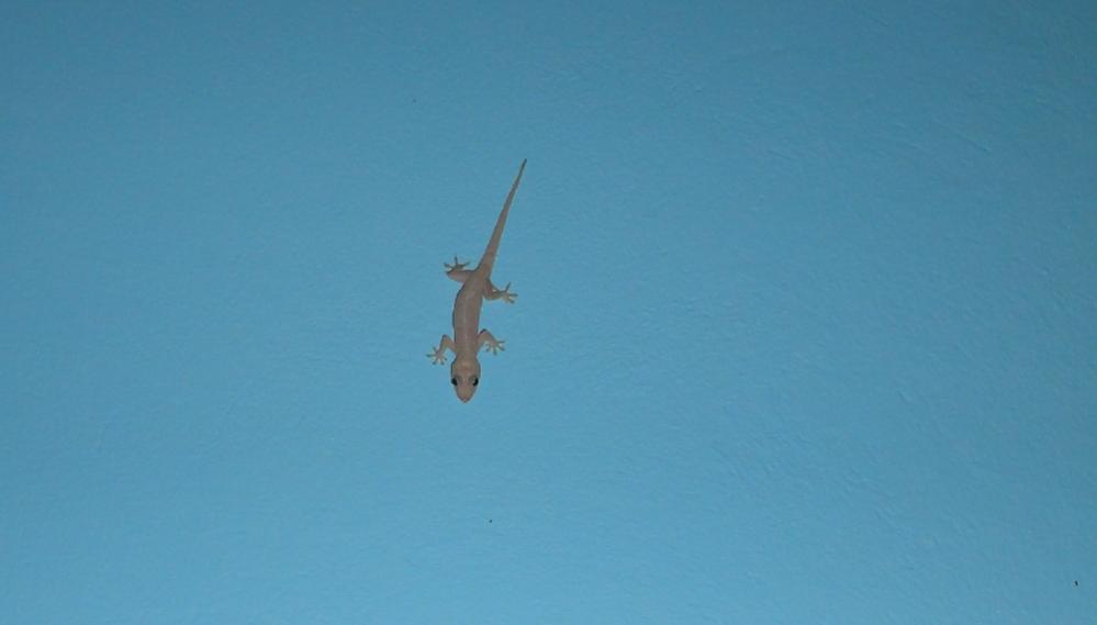 Last night we dined on conch bits at Sun Beach, washed down with copious amounts of Red Stripe. There was some kind of gecko festival going on, because at one point in our meal there were three of the little critters circling the ceiling above us. That ceiling is painted eggshell blue, which is not in the colour spectrum of the chameleon. Look at him trying to turn blue!
