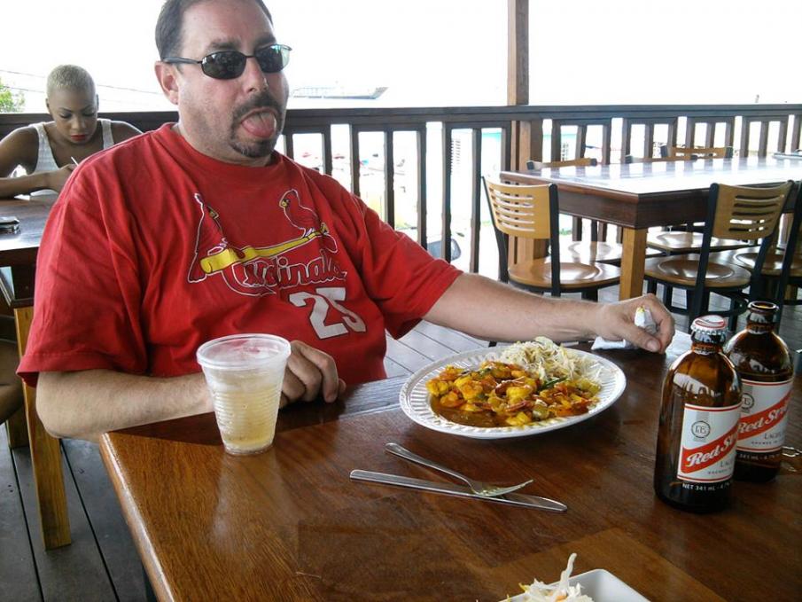 After touring the fort, and having some fun with a certain warning sign, it was time for us to toodle into Port Royal for a well-deserved lunch. After determining that the Pirate Pub was really just an ice scream stop with a beer cooler, we meandered through the dusty and deserted street(s) of Port Royal. Which was fine. The old architecture, lack of modernization and generally sleepy small town feel was causing massive good vibrations! And....we simply stumbled into Gloria's Restaurant. It started with spying a very cold fridge loaded with RS and wound up with us being ushered upstairs to the main dining area. Fans helped the oppressive heat and a virtual 360 degree view of Port Royal tempted our eyes. At first glance, the menu seemed a bit expensive....but we realized our options were quite limited. Once the food arrived, we sang a different song!