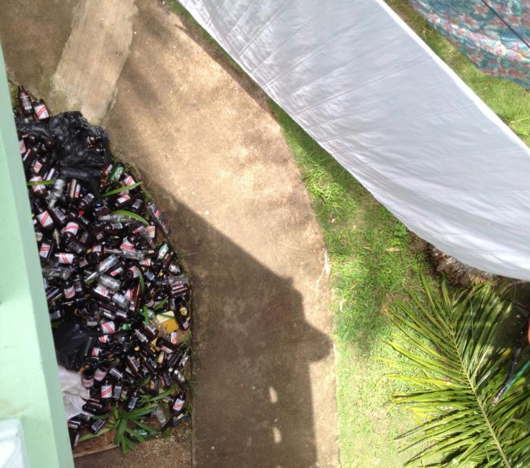 Last night is hazy. I woke up to this. JK it's just the hotel's recycle pile. We haven't made it to *that* day yet in this report. Haha! Lots to catch up on from yesterday and I've been working on it. I thought the likkle rainstorm would be a perfect time to write but it's too hard to take my eyes off the rain. SharkHunter has returned with his prey - a six pack of stripes an juices. Back to rain watching, I mean trip report writing. :cool: