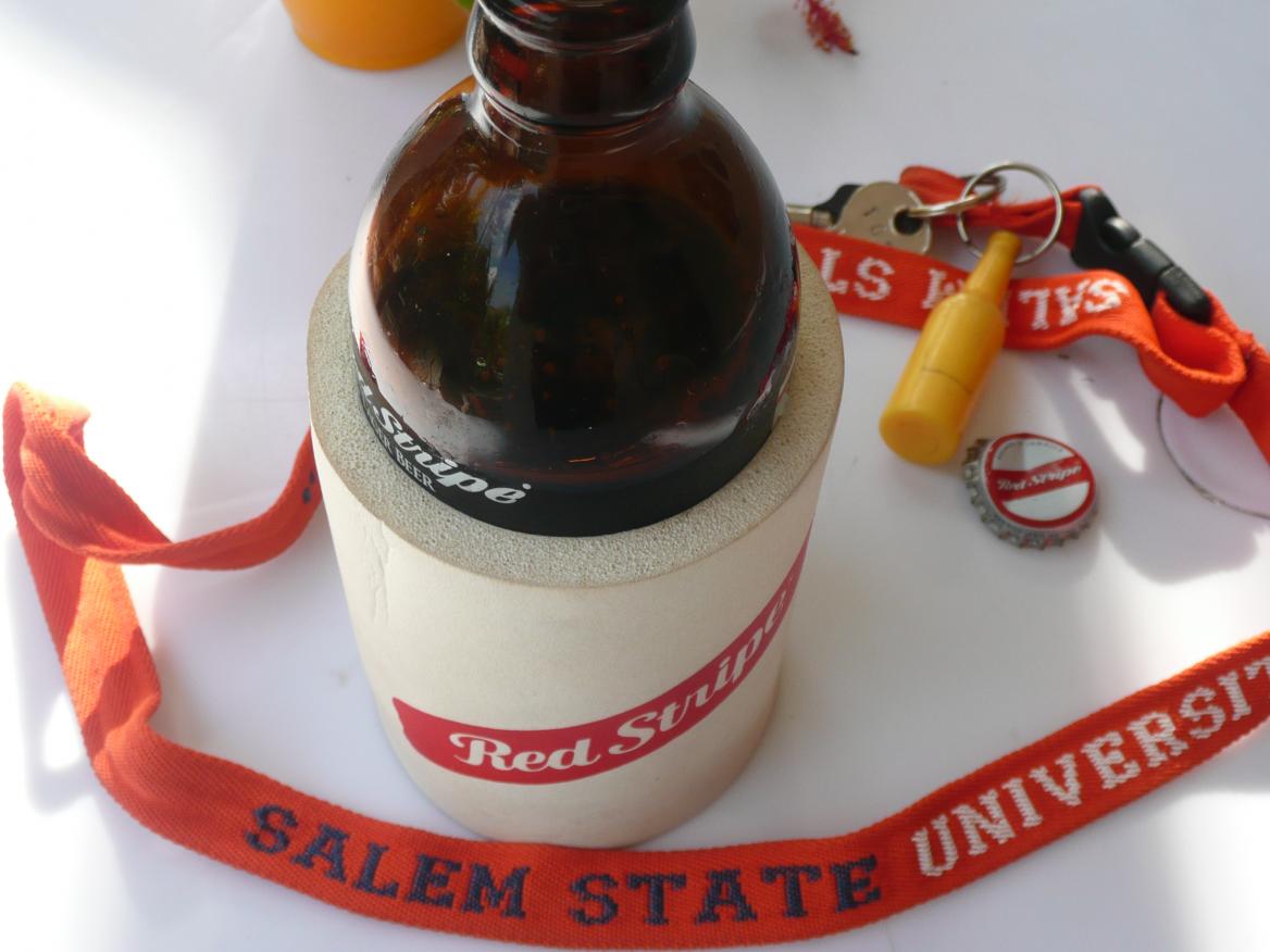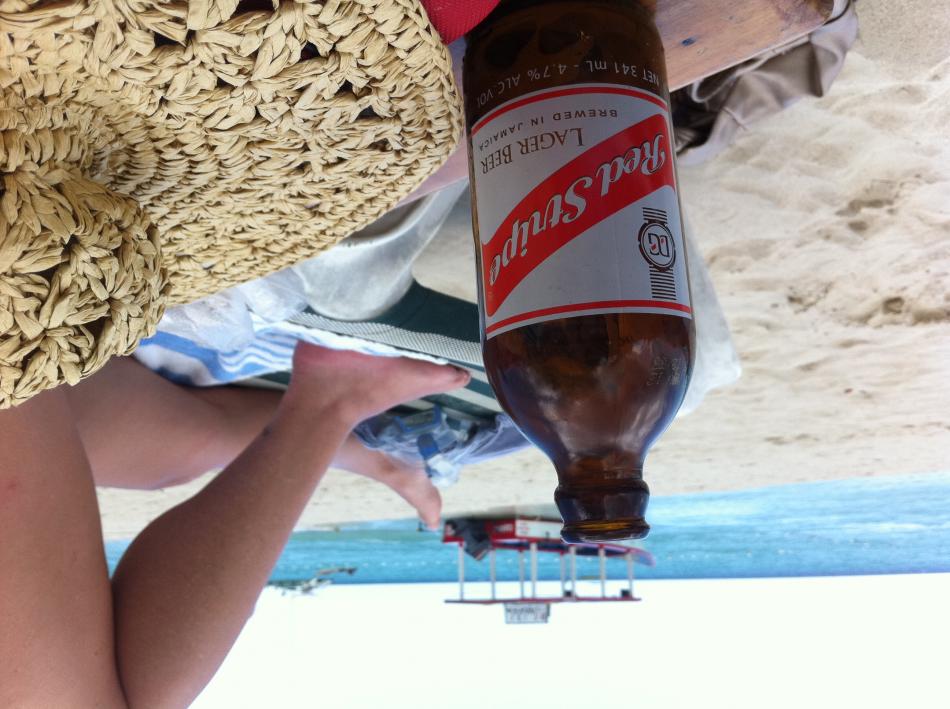 Photo composition...The Red Stripe bottle gives an object to focus on and the background gives the photo context and location...plus it's fun to post pics of beer and beach when your co-workers are back home working. :)