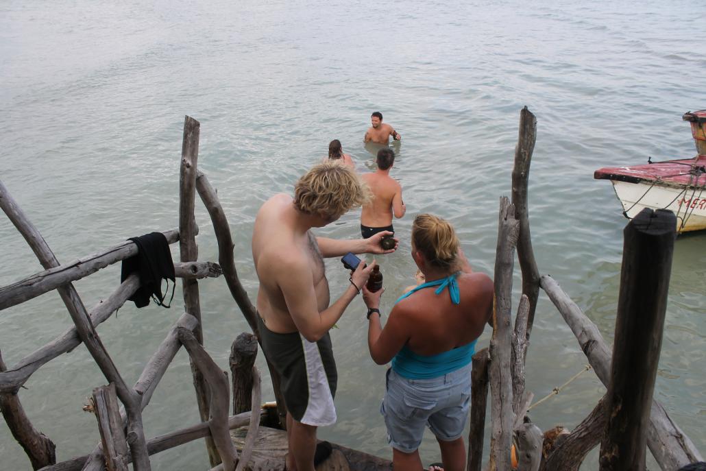 I saw the look on Daisy’s face and I instantly felt her pain. Sandie got to work immediately and Daisy let out a rather loud scream. I felt so bad for her and I didn’t know what to do or how to help. But it looked and sounded so painful and I hated to see my friend in pain so I did the only thing I could think of, I went to the bar and asked for a shot of rum. The bartended showed me the rum and asked “Appleton or overproof?” “woah” I said “Definitely the Appleton!” Then I looked back and saw Daisy and then heard her and I turned back to the bartender and quickly proclaimed “Make that overproof!” So he poured a cup of overproof and I took it to Daisy immediately. I handed it to her and simply said, “Drink this as fast as you can” And without question, she did just that, god bless her. Poor thing, she nearly choked after that rather large glass of gasoline I just made her drink but I like to think that maybe, at least for a short moment, it took her mind off the pain. I then handed her a Red Stripe as a much needed chaser. I am not going to lie, nothing about this minor surgery taking place in a bar made of sticks in the middle of the ocean in Jamaica, was pretty, that is for sure. But Sandie was a rockstar with that knife and serious surgeon like technique….and Daisy, was a trooper for sure! And soon, Sandie completed the serious procedure and all of the excitement died down a little, well for maybe everyone but Daisy. About that time the explorers had returned from the ocean and they got to hear all about the event they had just missed. What a day! There were some more drinks had by all and we wandered out to the deck to take in more of the fabulous views and snap some group photos.
