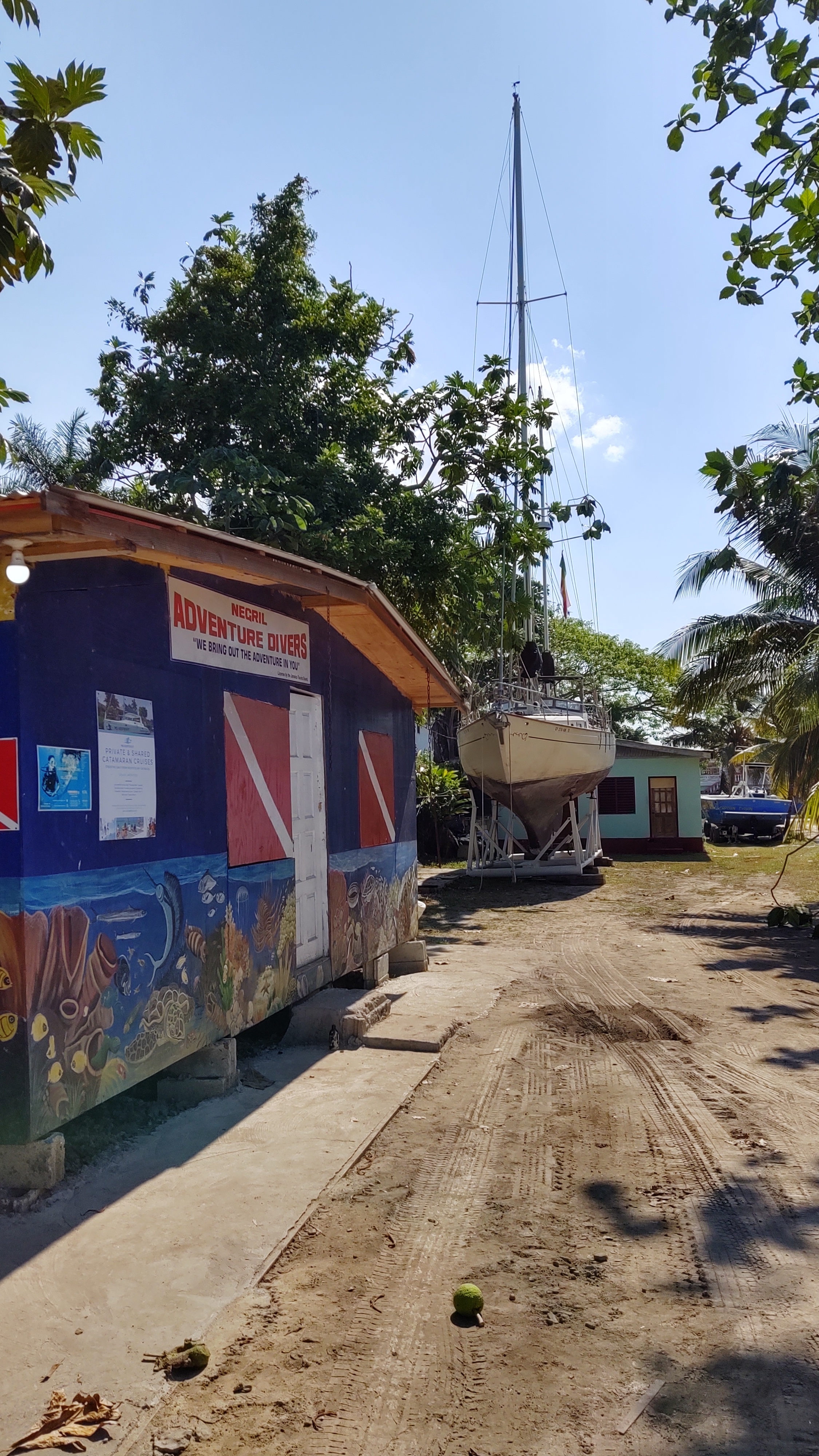 It's in the alleyway behind drifters. The owners rented a spot behind Negril adventure divers. They plan on taking several months to do the needed maintenance and repairs and then launching it back into the water from there.