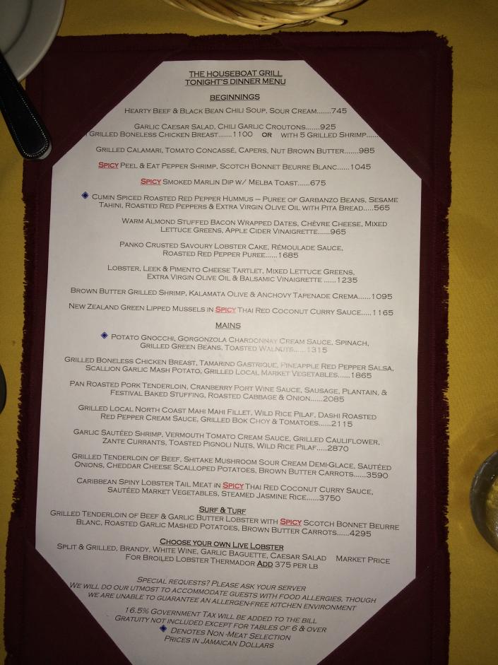 It was a very unique restaurant moored in the Montego Bay Marine Park Fish Sanctuary. We had dinner on the deck by the water and were entertained by the Huge, jumping fish in the water.