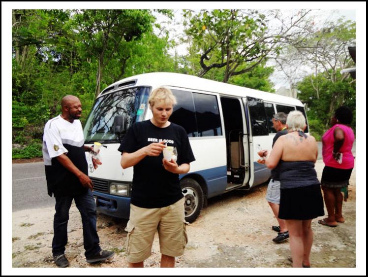We’re not rolling very long when we pull over at a long, low, narrow building. “Howie’s!!” Marley declares and we’re all pouring off the bus. Now Howie’s is an absolutely amazing food experience and should not be missed but like so much in Jamaica if you were to judge it by it’s appearance you might just miss out on one of the best experiences of your life. On first glance you might think you were stopping at a livestock barn. Open sided with iron gating around it, it looks like something out of the 19th century. This is a bit of a cool feat as Chicken says the building is only 30 or 40 years old. It went up and expanded as Howie’s food became more popular, and it’s popular for a reason. It’s incredible. And the open sides are necessary because they cook EVERYTHING on wood fires. Rows of huge cooking pots on a long series of grates, each poised above a pile of glowing embers that are constantly being fed with nicely cut bits of wood.