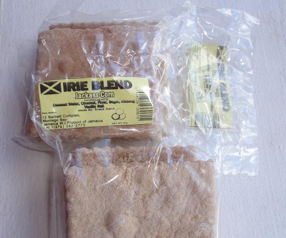 Then we went and picked up some more stuff – seems we shop for a little bit of food almost every day. Unlike back at home where we go to Costco once a week and come out with two hundred pounds of stuff. We stopped in at several places, here’s what we picked up: ackee, tomatoes, water crackers, papayas, diet coke for rum mix, callaloo, onions, plantain chips and six packs of jackass corn. What’s jackass corn, you might ask? Little snack biscuits, see the photo below. I love ‘em, but not as much as gizzadas.