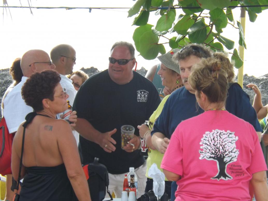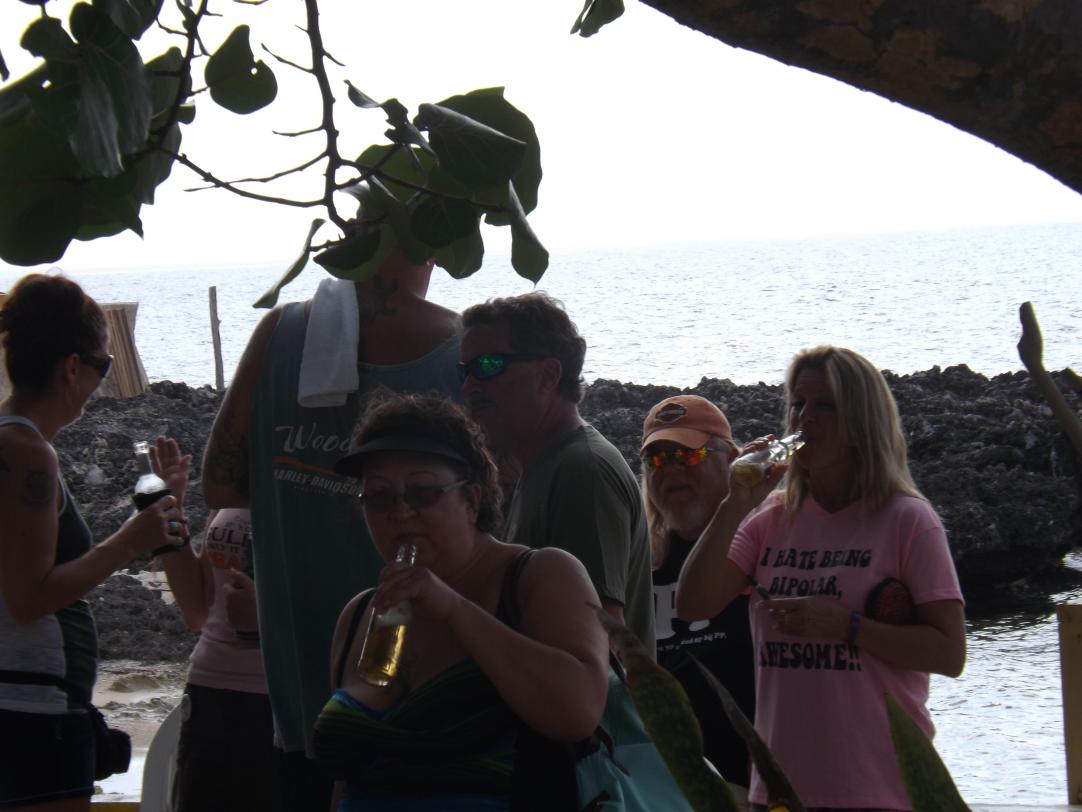 Janet has a beer, I have a punch and I look for the spot...there is always a spot...just gotta step around the corner and there it is, the sub station...lol..I walk off for aminute, make a new friend, and share a smile.....when I return, I had to look around to find Janet, as she is off igving away goodies...There are a few snacks at this stop...very good fritters....once we get off the bus, lembert leaves, he says he is going to pick up all the cliff people, as they are at another stop, then he comes back with an empty bus.....well, we get back on the bus, and off to the next stop, which is ON THE ROCKS, I had never been to this bar, so It is nice to visit somewhere different.