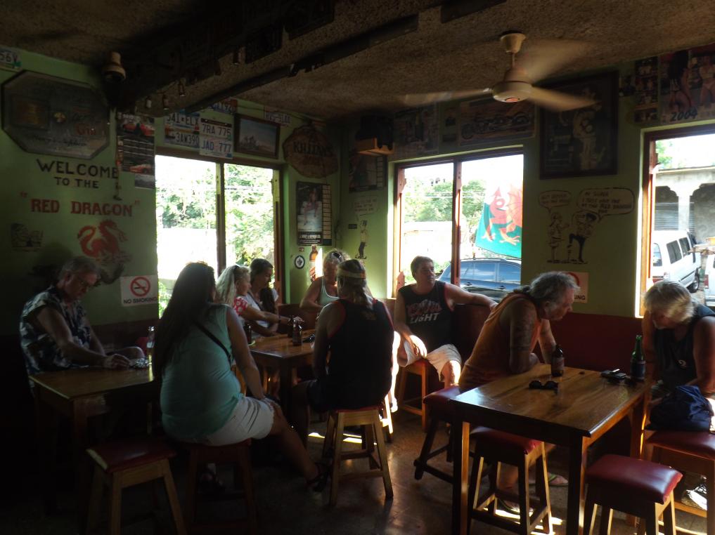 we walk from collettes up to the red dragon bar....some call it raggabones....more cold beer...billndonna go in another direction, they had just left red dragon...we might run across them again this week....red dragon also is known for the jerk pork, but we decide that we want something else for lunch, so just beer and social at red dragon...a group of 8 or so are in ther, and they are a familiar group...they were here in april when we were here...they come for 6 months...