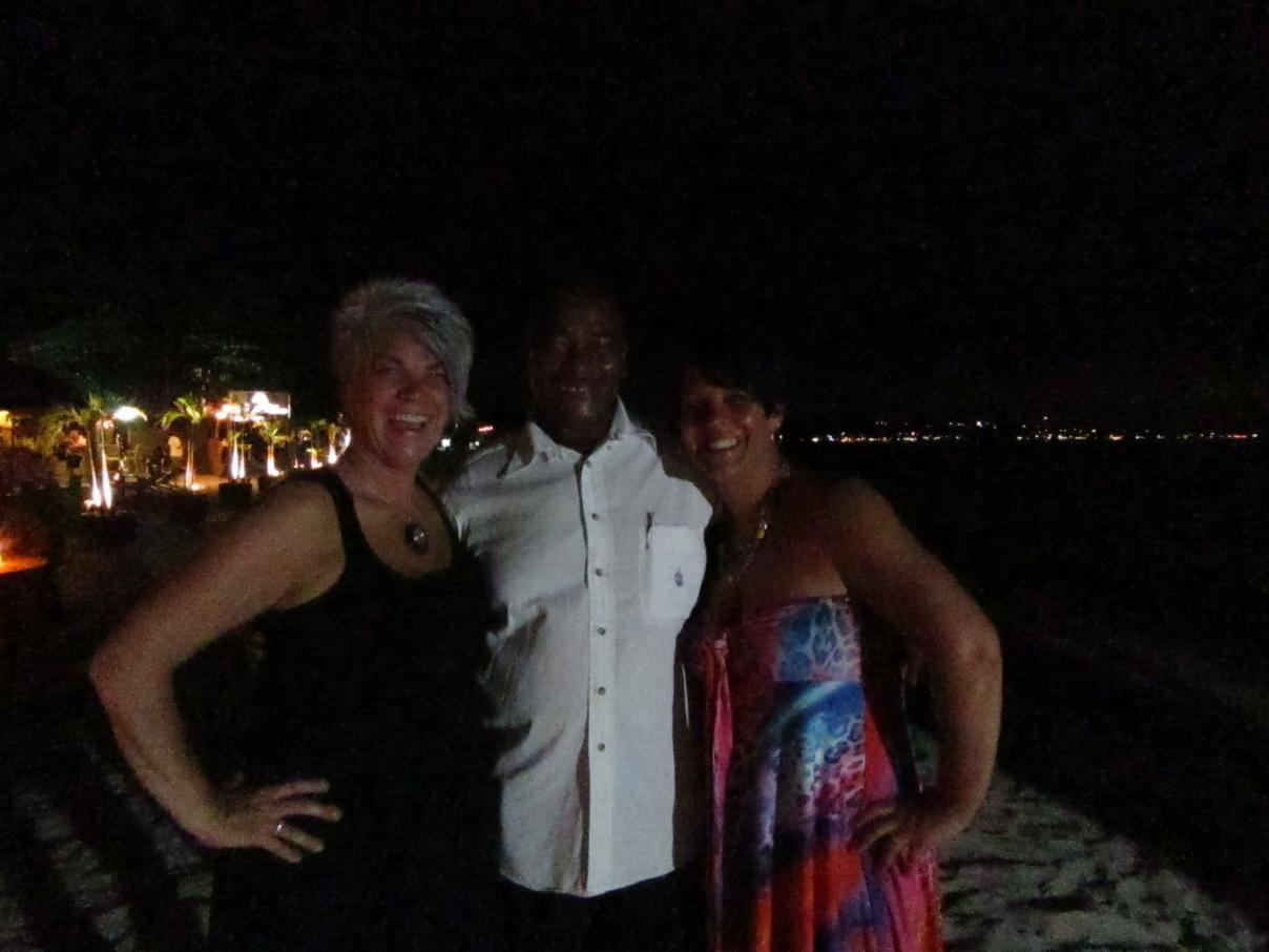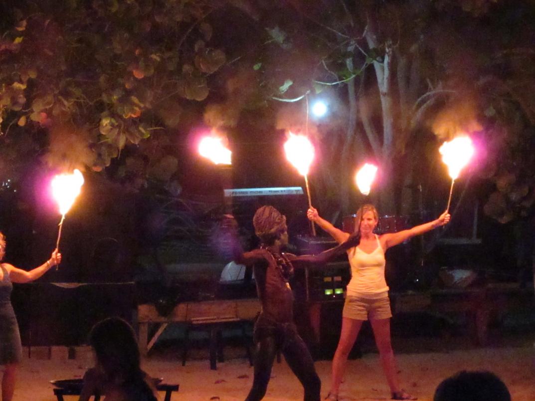 Dennis meets us on the beach and we get the table closest to the water. The band is playing and they sound nice. Round of drinks - and we order dinner. Had the lobster bisque before dinner. Jamaican chicken for me and Aims and the guys had lobster. So in between bisque and dinner - Aims and I went off to the bathroom. Walk up there and there is a guy standing there in basically a net tank top and shorts talking to himself. Ok...whatever. Well, she came out of the bathroom first and he at this time was in a loincloth saying "hey" over and over to her. Remember this experience (not at an AI) is new to her...so she mostly just stood there looking away from the man in the loincloth whispering "hey" while rubbing something all over his body. I come out - she doesn't say anything until we get back to the table and then I simply laugh. Dinner comes and the band takes a break...just in time for the next part of the show. A fire dancer. NOW it makes sense. Loincloth...check....some sort of anti fire stuff rubbed all over ...check. We watch the show - good time - crazy, but interesting to watch. Here's some photos of our night: