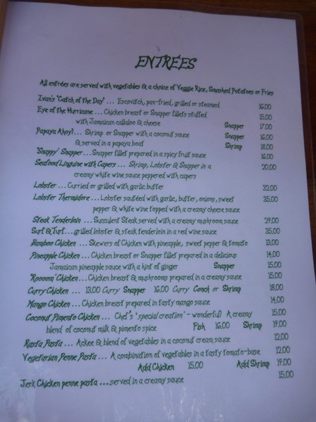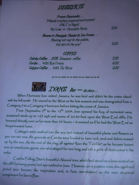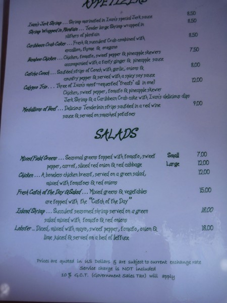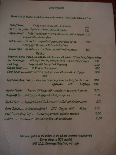 We did not think Catcha was out of line price wise at all. For comparable quality, Ivan's is way less expensive than restaurants in British Columbia. We averaged $130 day for food and quite a few drinks. For the price of drinks, I think the dirty bananas were around $7 and sour sop martinis were $8, there is a thread on old board with drink menu pictures. Below are Ivan's food menus...