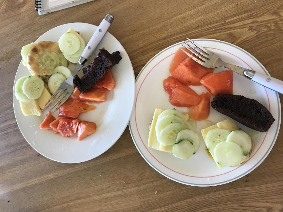 Because we woke up so late, I decided to cancel the brunch cooking idea. I hit the beach instead. We bought some fruit and coco bread and chocolate cake on the beach. We had a Finnish Jamaican breakfast- Cucumber & cheese sandwiches, coffee, cake and fruit. yum. Attachment 48205