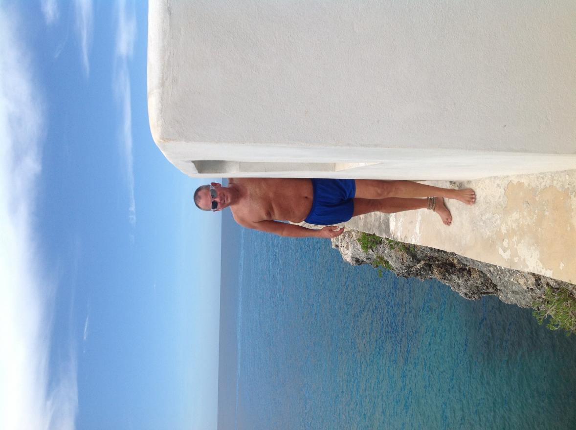We got our suits on, lathered up in sunscreen and hit the cliffs. Crash in the hairs for a few hours, have some fresh juice and about 14 bottles of water to rehydrate! We swim for a little bit and my wife tells me to jump off the big cliff so she can video it on my iPad. I was jazzed, ran to the room, got the iPad and went back to the cliff, gave it to my wife and took my position. When I got up there I looked down and thought that I must be nuts to have jumped yesterday and it dawned on me that it was liquid courage! It took me a few seconds to jump but I did it and was so fired up that I did. I get to the ladder and my wife says, sorry honey I forgot to push the start button, I'm like REALLY? Back up I go, I ask if she has started the video, I get the annoyed yes dear response so off I go again this time without hesitation. Get to the ladder and what do I hear but I'm sorry honey I must have stopped it before you jumped, can you do it again? By now I'm thinking with this hangover there isn't a jury in the land that would convict me if I pushed her off the cliff and something happened to her! This time I have her stand in a spot by the ladder, I start the video put the iPad in her hands and caution her to not move a muscle, that when I get out of the water I will stop the video. She starts to laugh, snort and make me crazy, I haul ass up the steps to MY perch, ask one more time if its still on and then jump. Here is the video;