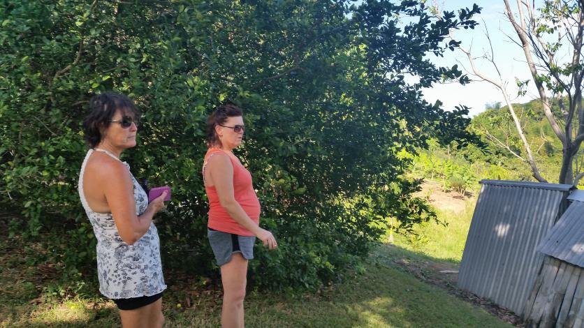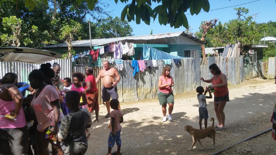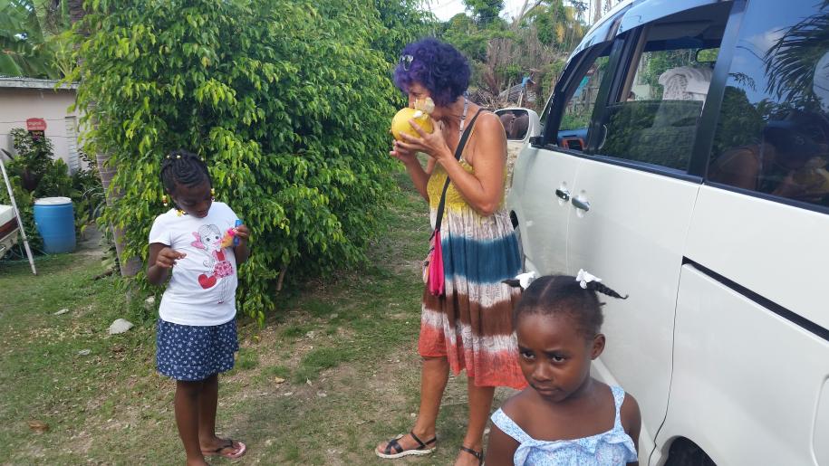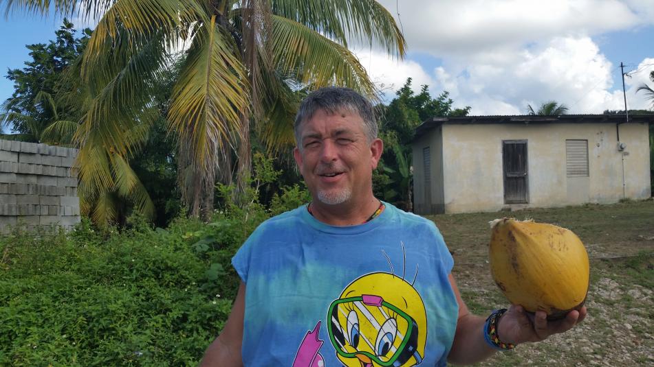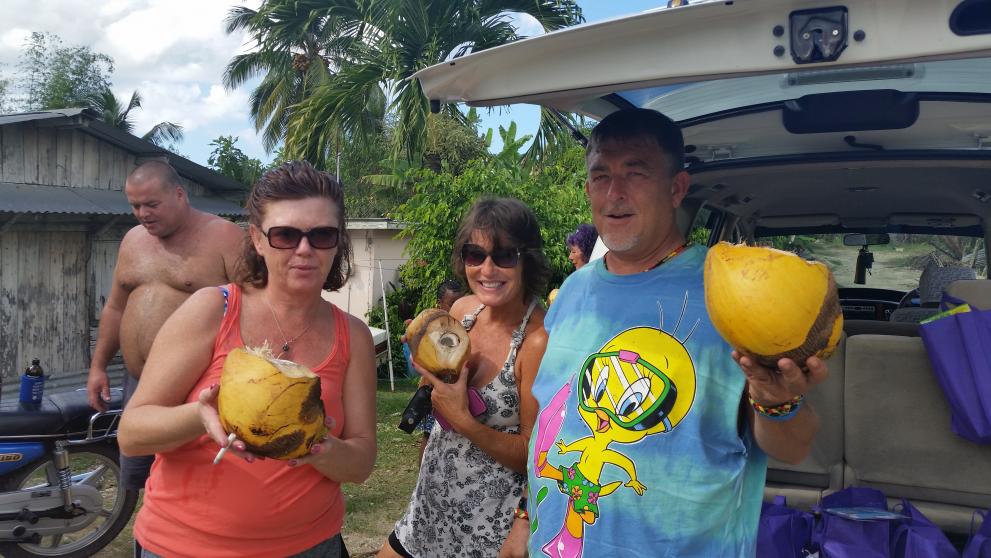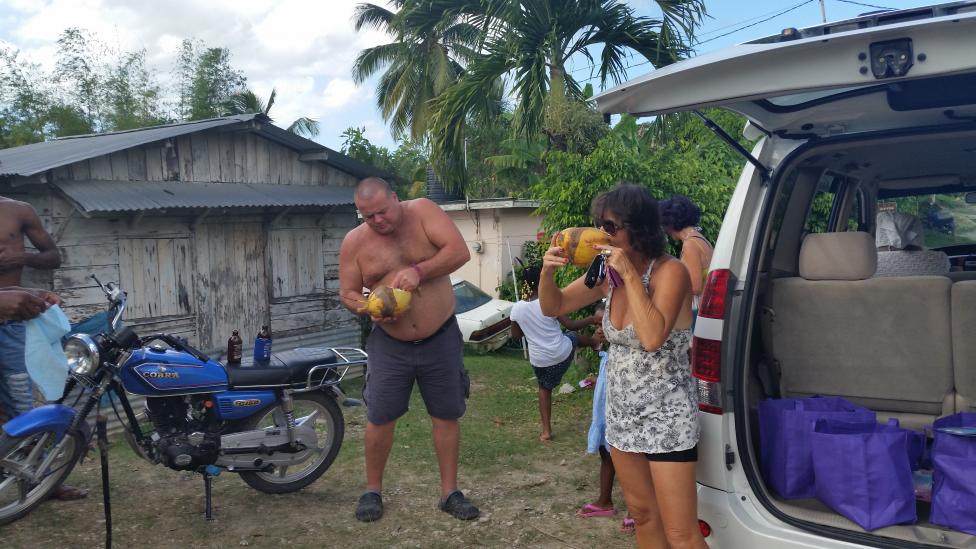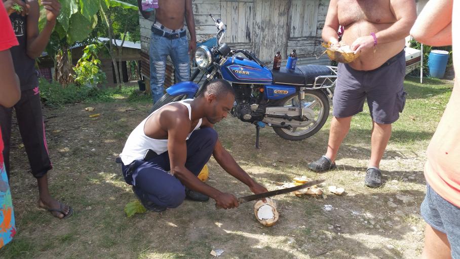 the next stop was at Dwaynes moms neighborhood...Dwayne sent someone for fresh coconuts, which he fixed up for refreshing water for us....