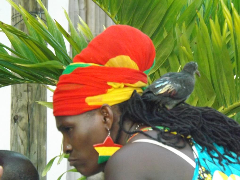 bird on her shoulder