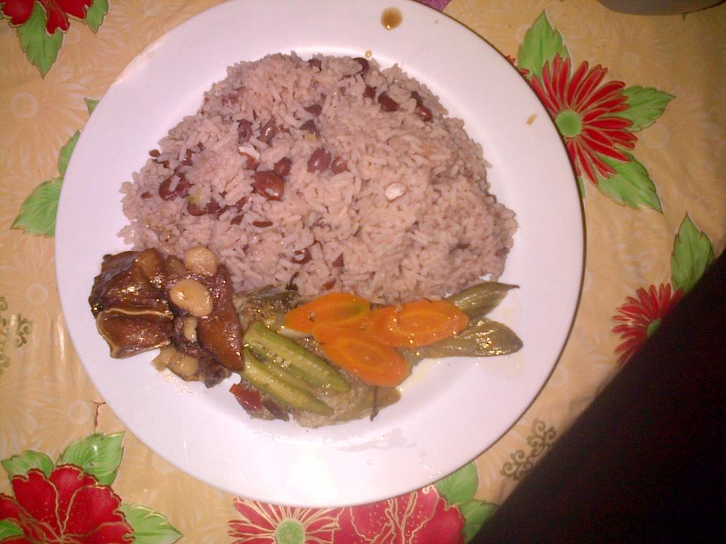 Rice and peas and chicken on a Sunday is like a Jamaican ritual. Most Jamaicans believe that if they are going to eat at-least one "proper" meal a week it must be on a Sunday and that meal should be nothing less of rice and peas and chicken (fried chicken in most cases). Even if they have had rice and peas and chicken several times that week, it is just not as ideal as on a Sunday afternoon. Take a look at this beautiful and delicious home made Sunday Special. Yummy :)