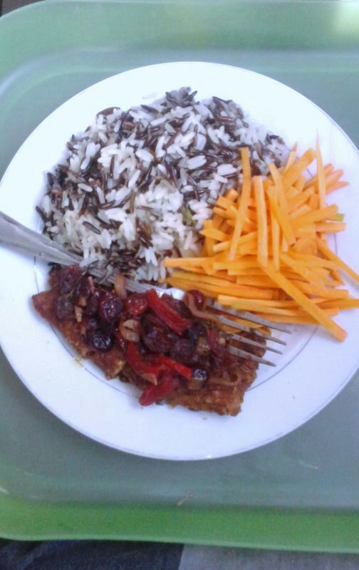 Wild Rice mixed with Parboiled Rice, French Fried Chicken with Cranberry Raisin Sauce and Julienne Carrot :D