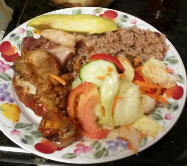 Rice and Peas and Chicken, Vegetable, avocado and little bit of stew peas