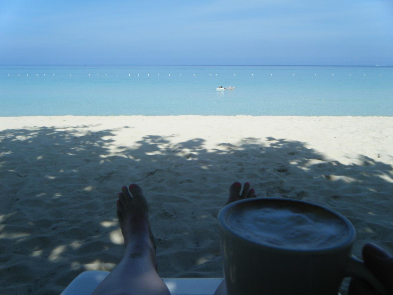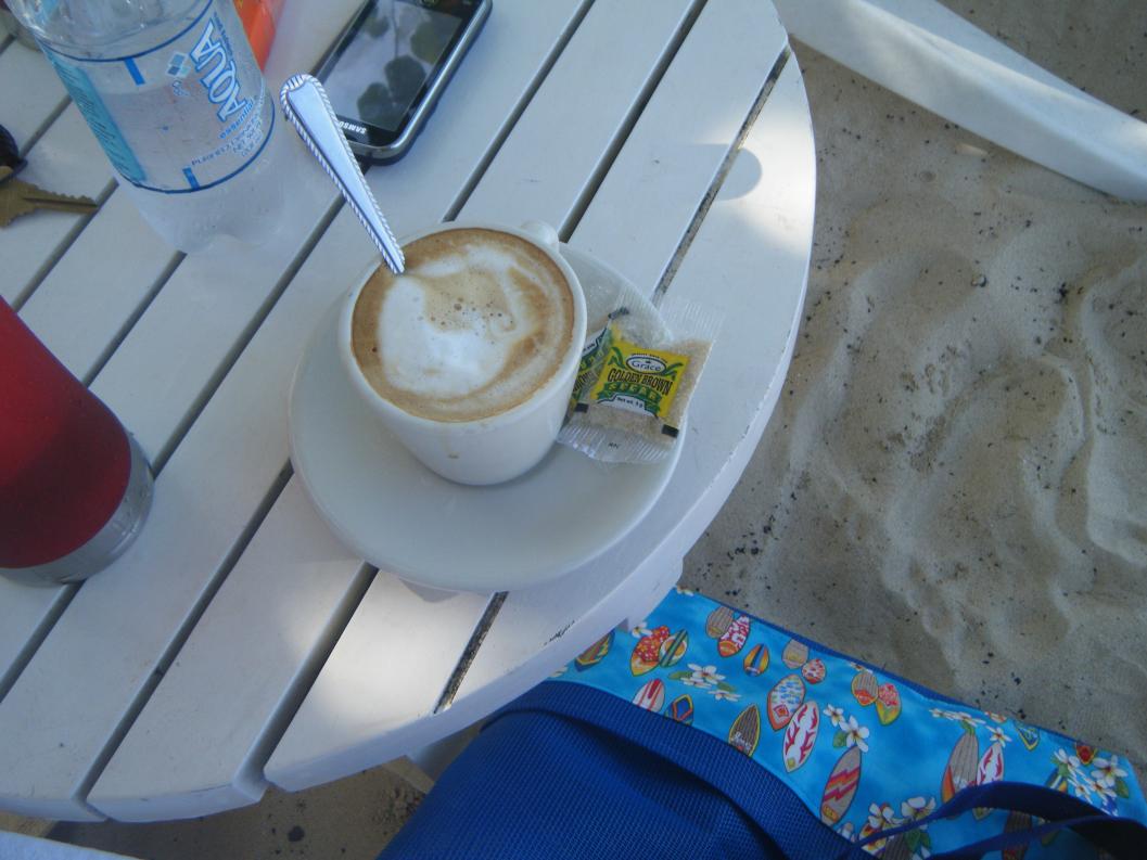 Wednesday morning! Yeah – we’re at the beach and the weather is perfect! We started our day with breakfast from room service on our screened in porch. Then we did what was soon to be our daily routine. We meander down to the beach, get a cappuccino (well, I did, they were great!), lay in a lounger until we get an idea about doing something and then if we still remember what it was when we get up, well then that’s what we do. Most of our brilliant ideas involved floating in water and eating, then beverages when we felt parched.