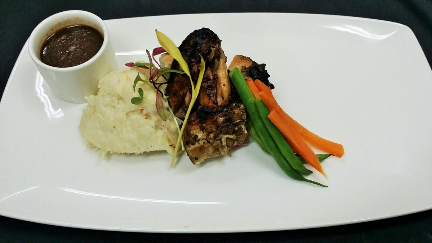 A quarter of authentic jerk chicken seasoned to perfection served with a complementary Red Stripe.