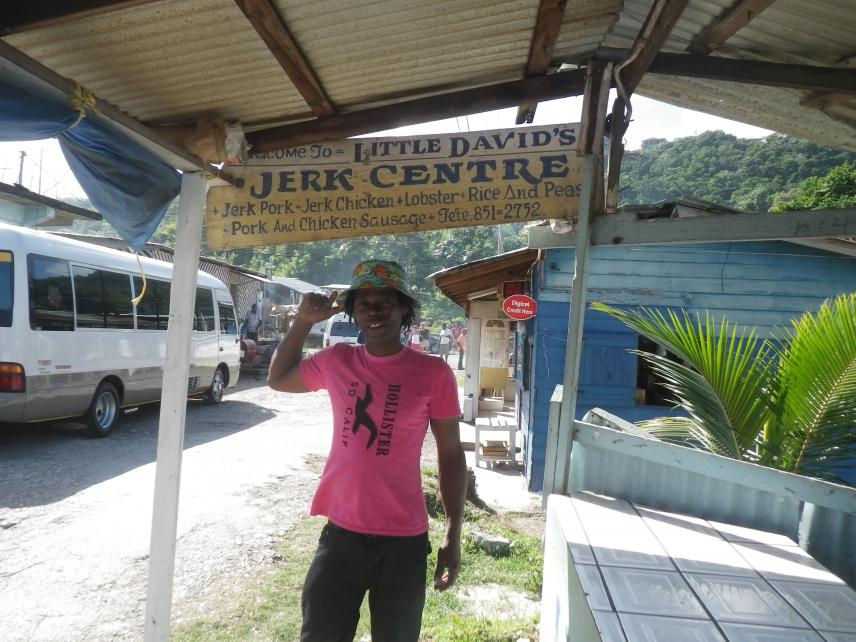 At the nearby Boston jerk center. We tried a few places as we stopped there 3 times on our trip. One day we drove there for the sole purpose of getting some jerk chicken sausage from Mikey. Never had anything like it on the island before. Chicken, onions and spices. No casing, no filler. He showed us how he made it and we will be trying his method soon. David had the best pork we tried, he is the last shop down the strip on the left.