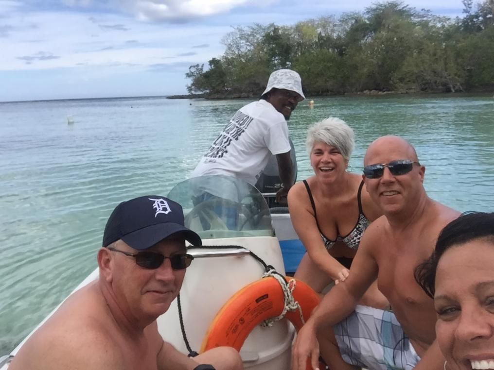 So we arrived at the beach at Half Moon and just took it all in. I LOVE the hustle and bustle of 7 Mile - but this was simply glorious. It was so quiet and peaceful, even though there were several people out and about. I imagine this was what Negril was like many years back. We hung out and took it all in. Tom went and bought a round of RS Lights and we just hung out. Before too long, Marvin pulled up in the boat to take us out to the island. Last year we had planned on coming here, but (as Brian would say) sand "paste" got us. We planned to come out on Thursday - but rum got me. So here we were...on Monday. Marvin was a ton of fun and we spent some time throughout the day just chatting with him. What a great guy! So he took us out to the island - some pictures of our approach...