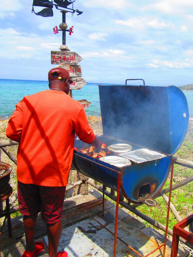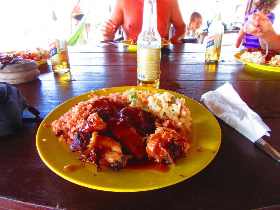 Pretty soon the place started to fill up. Kathy Gillespie and friends arrived along with Charlotte and Luna. The kids added a different element - but they were mostly busy with tiny crab races. :) Livingston was busy preparing lunch and had taken our order. The food was plentiful and reasonable! It was by far the biggest plate of food I have ever had in Jamaica. You had a choice of jerk chicken, fish, or lobster. I chose chicken and the other three got fish. It also came with rice and peas, macaroni salad, coleslaw, and potato salad.