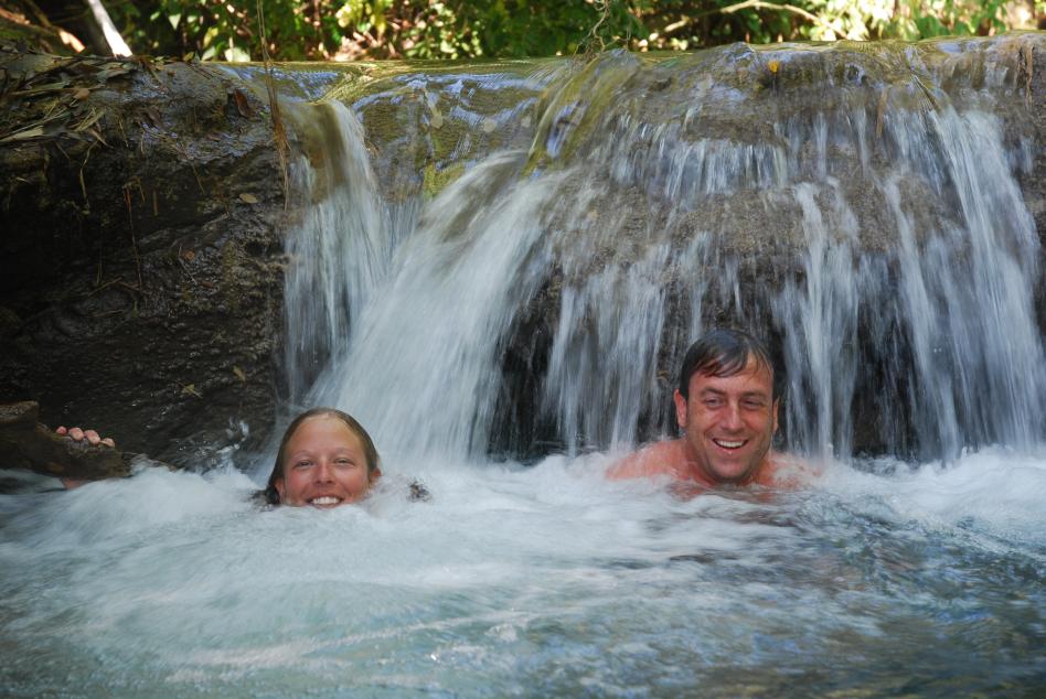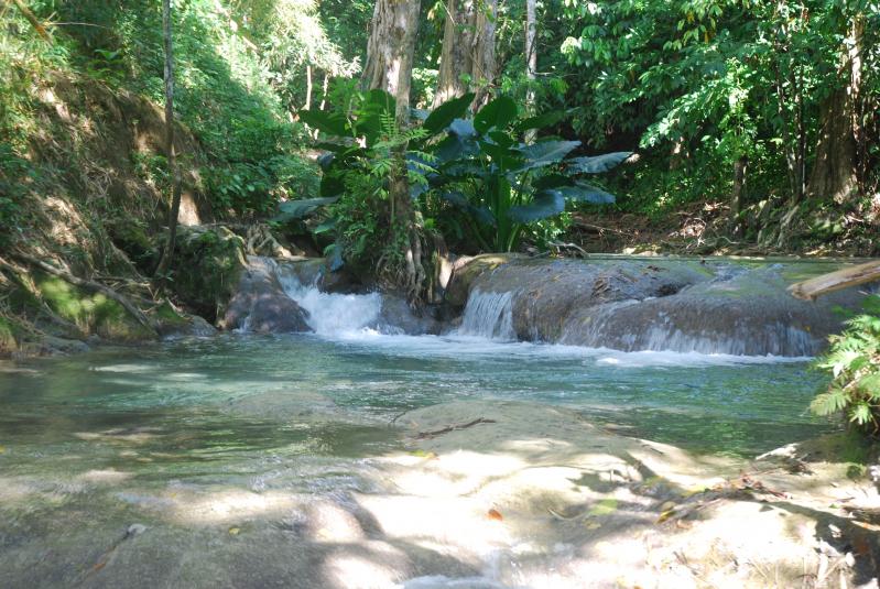 We arrive at Mayfield Falls. We pass the first sign for Mayfield Falls and head to the second. Chicken says the first one- the river is harder to walk. Has anyone been at both, just wondering? We grab a stripe by the road and head down to the bar area. Say hello to everyone, pay our entry fee and meet Sheldon our guide. He takes us down to a little bamboo hut to chill and regroup before the river walk. He has a waterproof bag for our stuff and we're off. The first glimpse of the river I'm just in awe...