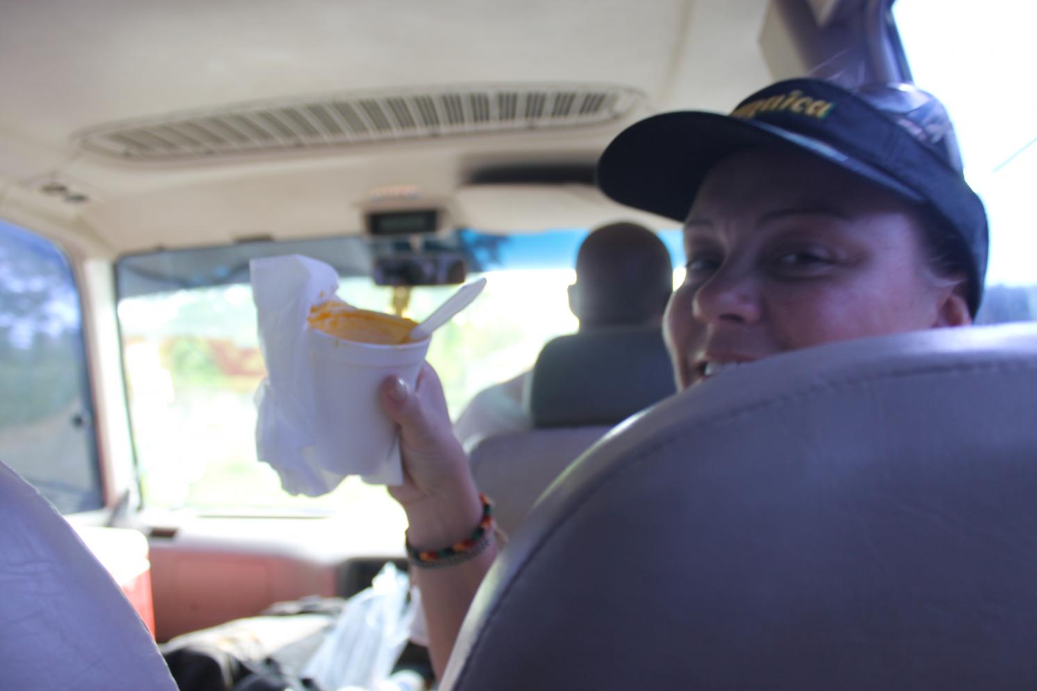 Making it back to the bus we all piled on and headed for some lunch which is good because that road jamaican moonshine I made was still making me feel a bit off. Every Time we’ve come here we’ve stopped at Howies Cook shop so why should this be any different. Every time we stop the food hits the right spot. You knew we were being satisfied cuz well not even one person was saying anything. A food hush fell over the group and the low murmurs of satisfied travels was wall you heard. An occasional yum, or special mouth filled acknowledgement was all around. A wash of comfort filled my body and I pretty much inhaled my food. The clouded groggy moonshine feeling was slowly replaced by a want for more and more food. To say the food was delicious would be an understatement. Soon after we finished we headed to Middle Quater to get some shrimp. I remained on the bus because I was fighting back the food groggies and the booze groggies. Shauna wandered onto the bus and offered me some soup. I hadn’t been part of the soup virus that had seem to attack my fellow turtles. First Daisy succumbed and then like dominos one after one they all had these little white cups of soup. Have you ever seen invasion of body snatchers when they say just go to bed. This was like that but in a totally pleasing way. I had one spoonful of soup and I think I would’ve have sold my mom for more. That small cup wouldn't have satiated the smallest of appetite , in fact i think it would/did make me hungrier but I wasn’t about to rip that cup out of Shauna’s hands I mean people were watching :). Well a wash of warm fuzzy came over us all and soon we were ready to take the next leg of our trip.