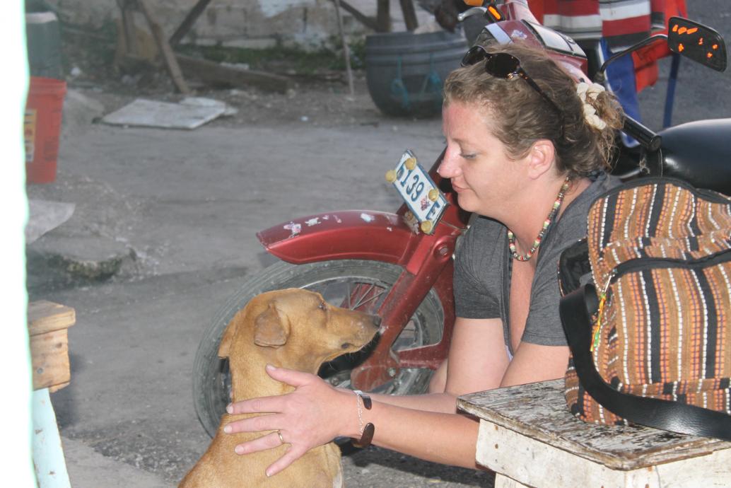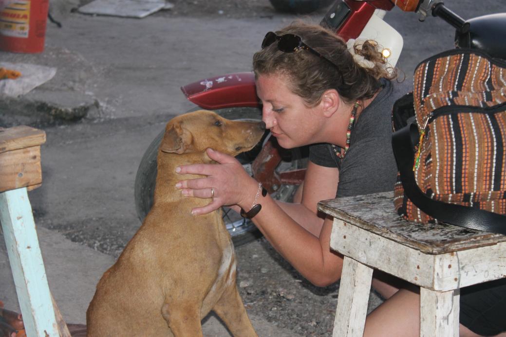 There was a little shop right where we were that had drinks and snacks and what not. The owners of the shop had a couple of dogs. If you know Sandie, you know she loves all animals, but especially dogs. So she walks up to them, and as she is approaching the owners yell out to her “No, no” and then they make this hand gesture like a dog biting. They tell her the dogs bite and not to come near them. And so what does Sandie (aka dog whisperer) do?