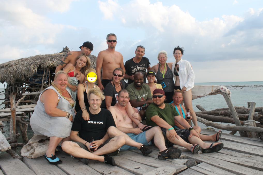 I saw the look on Daisy’s face and I instantly felt her pain. Sandie got to work immediately and Daisy let out a rather loud scream. I felt so bad for her and I didn’t know what to do or how to help. But it looked and sounded so painful and I hated to see my friend in pain so I did the only thing I could think of, I went to the bar and asked for a shot of rum. The bartended showed me the rum and asked “Appleton or overproof?” “woah” I said “Definitely the Appleton!” Then I looked back and saw Daisy and then heard her and I turned back to the bartender and quickly proclaimed “Make that overproof!” So he poured a cup of overproof and I took it to Daisy immediately. I handed it to her and simply said, “Drink this as fast as you can” And without question, she did just that, god bless her. Poor thing, she nearly choked after that rather large glass of gasoline I just made her drink but I like to think that maybe, at least for a short moment, it took her mind off the pain. I then handed her a Red Stripe as a much needed chaser. I am not going to lie, nothing about this minor surgery taking place in a bar made of sticks in the middle of the ocean in Jamaica, was pretty, that is for sure. But Sandie was a rockstar with that knife and serious surgeon like technique….and Daisy, was a trooper for sure! And soon, Sandie completed the serious procedure and all of the excitement died down a little, well for maybe everyone but Daisy. About that time the explorers had returned from the ocean and they got to hear all about the event they had just missed. What a day! There were some more drinks had by all and we wandered out to the deck to take in more of the fabulous views and snap some group photos.