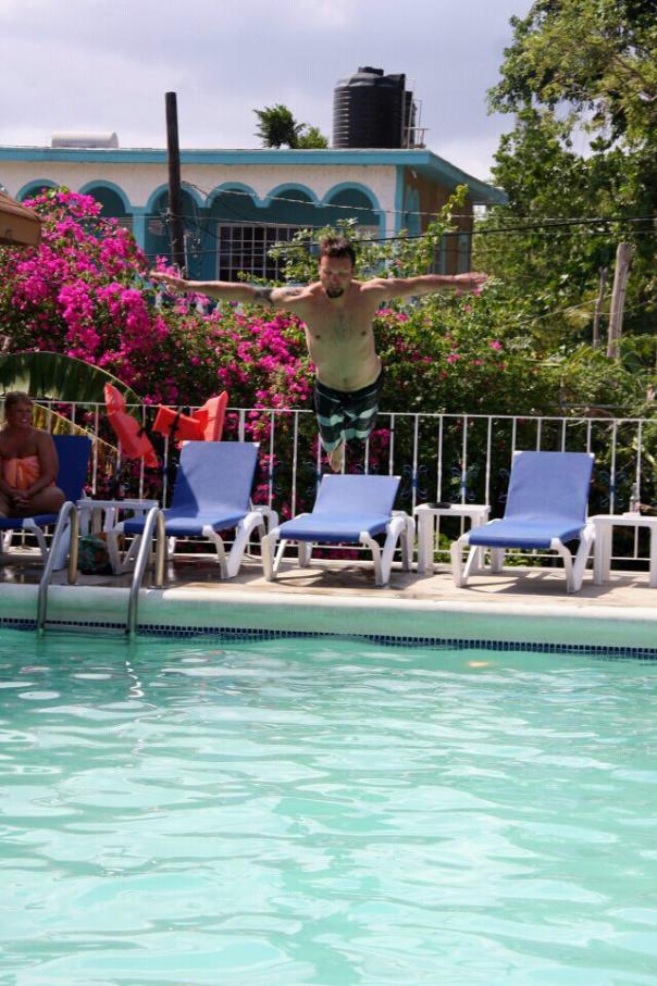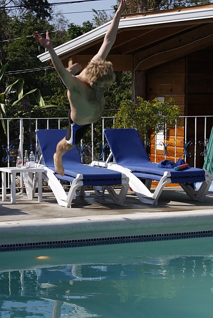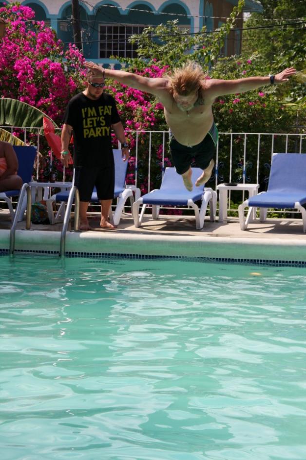 Maybe this is the time Jon takes the leap. Like I said, I don’t exactly remember the order. But I do remember the flop. It was stunning. Honestly, and I’m not playing favorites, this was one perfect belly flop. He is lean so I was thinking, Oh c’mon how is he gonna even compete?? LOL Well he starts moving around tables and loungers and takes as much of a running start as he can manage….then flies HIGH through the air in perfect Flop form. The impact was loud and the splash was impressive. I didn’t realize it until the Second round of flops when he opted out of flopping at the last second. He was hurting pretty bad after the first one, and I’m just glad he had his priorities straight.
