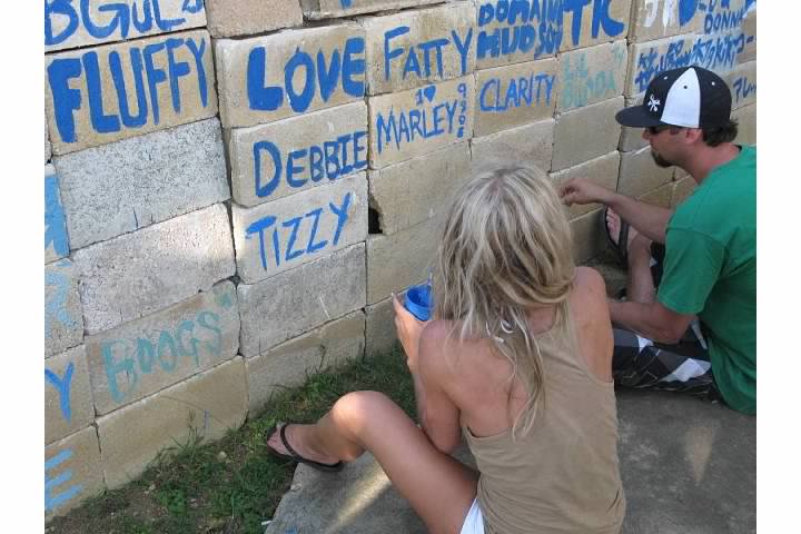 Outside everyone had gathered in around the brick wall. Some people were milling around with a drink in hand talking and joking around while others had brush in hand and already leaving their mark