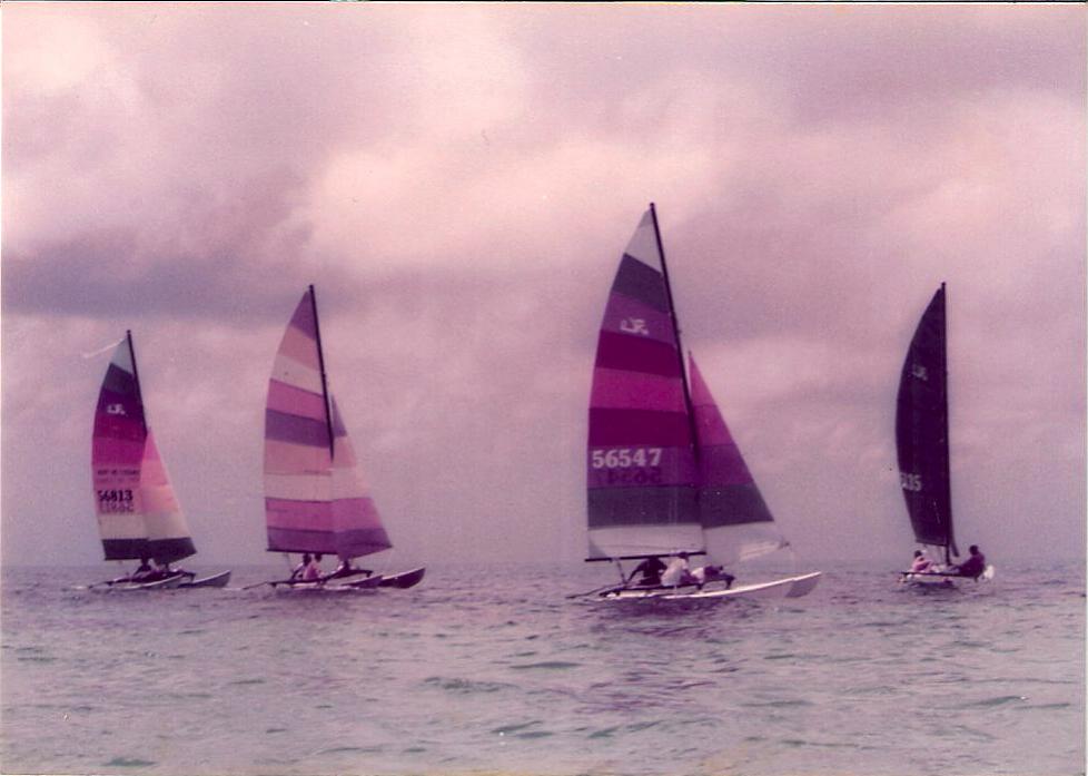 Not of a Hobe Cat, but my first time out on a little catamaran. I was hanging out on the beach one day, as was my wont, when I spotted three new girls setting up on some beach chairs. One of them in particular was quite cute, so naturally I lavished most of my attention on her. I came to find out that they were Canadians and had only been on the Island for a day or two. I chatted them up and eventually made a date to pick them up that evening to go out drinking and dancing to some reggae.