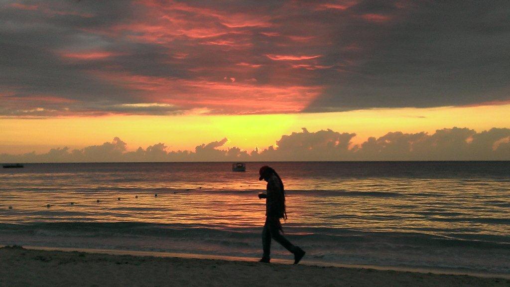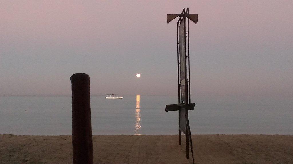 Full moon setting into the Carribean while the sun begins its rise over the Great Morass. 6:37am 1/27/2013.