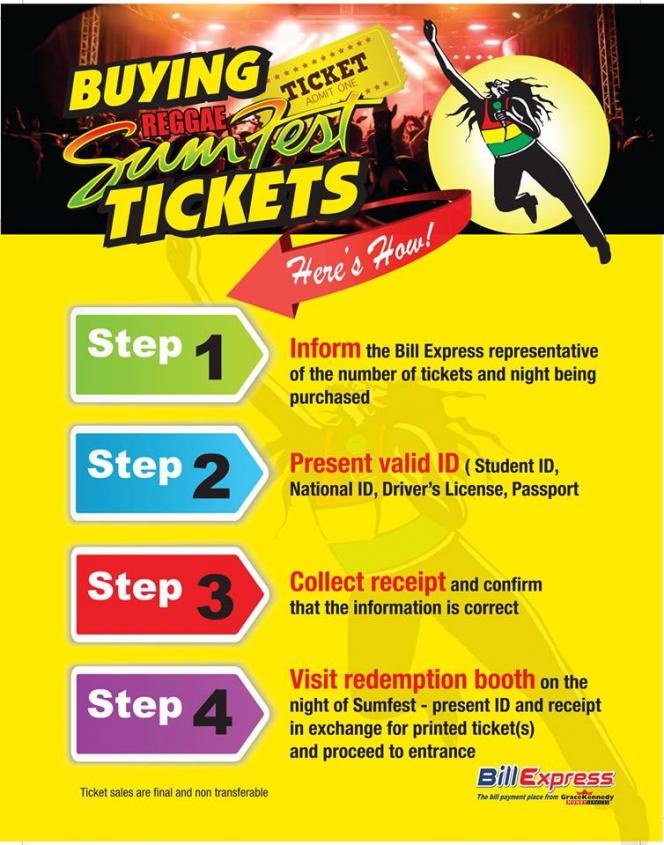 Reggae Sumfest tickets will be available for sale at select Bill Express outlets nationwide from (July 1). Just follow these 4 easy steps to complete your purchase.