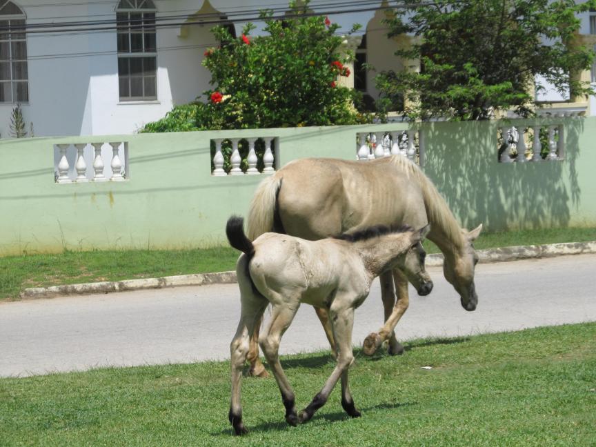 OK, I apologize for that trip through my tangled brain, meanwhile back at the trip report . . . we started out walking back. We saw a curious (gotta be Negril) sight. Running parallel the Redground Rd./Tankhill Rd. is a green space about a block long and maybe a quarter of a block wide. We saw a mare and her foal grazing on this green strip, completely unfettered.