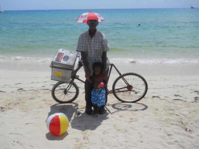 Norman aka Indian has the same set up and sells on the beach. He has a cardboard box and also sells bag juice etc.