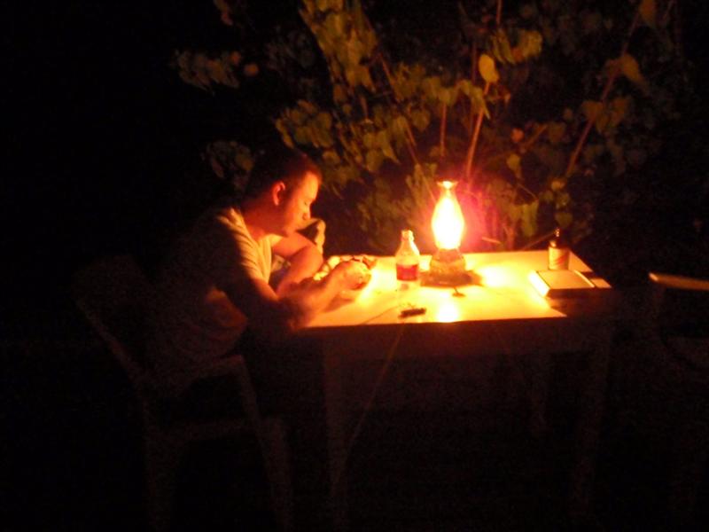 We were hungry and didn't want to stray far, so tried Murphy's again for chicken, but no chicken tonight. We had a conversation with a really nice man there, he wrote down his name, but I can't tell if it's Lenile or Leniel. He felt bad about not having any chicken for us and said that they just hadn't been selling enough lately to cook it up every day. They just end up wasting it. I hope their business picks up, would love to try out their food. He did say he would have food ready with advance notice, so someone could stop by early in the day and order dinner for later that evening. Maybe keep that in mind if you want to try to eat there. We headed back down the road toward town and stopped at the first jerk barrel we saw, which was Jam-Can. Nice folks there, we ordered some chicken to go and took it back to Citronella to eat. It was well-prepared, everything had a good flavor. Their jerk sauce was too sweet for us, tasted kind of like american bbq sauce, so it would be good for people who don't like spicy foods. It was fun to eat by the light of an oil lamp on our verandah-- Tulip stopped by, think she thought it looked fun too, the food part anyway.