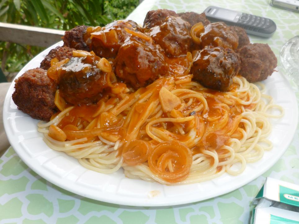 Bobo sets off and Pooper and I head up to Catcha to meet up with our Joey and his lady as we have a hot date with Bentley for some crab. We chill for a bit and than off we go to Bentley's. It's my second time there as I had been earlier to order up and make a deposit. It's everyone's first time eating there and we are all looking forward to the experience. As soon as we show up Bentley puts us on the corner of the deck where the best air flow is and we proceed to chit chit about all things crab and old bay. Soon enough these massive plates of food make their way out and just before we dig in I ask Bentley if he could point out what's on our plate. If you have eaten here before you know how animated he gets at this point. After some big smiles and laughs we dig in and it gets quiet all of a sudden. The other 3 had crab with some other goodies and I had spaghetti and meatballs, lots of meatballs.