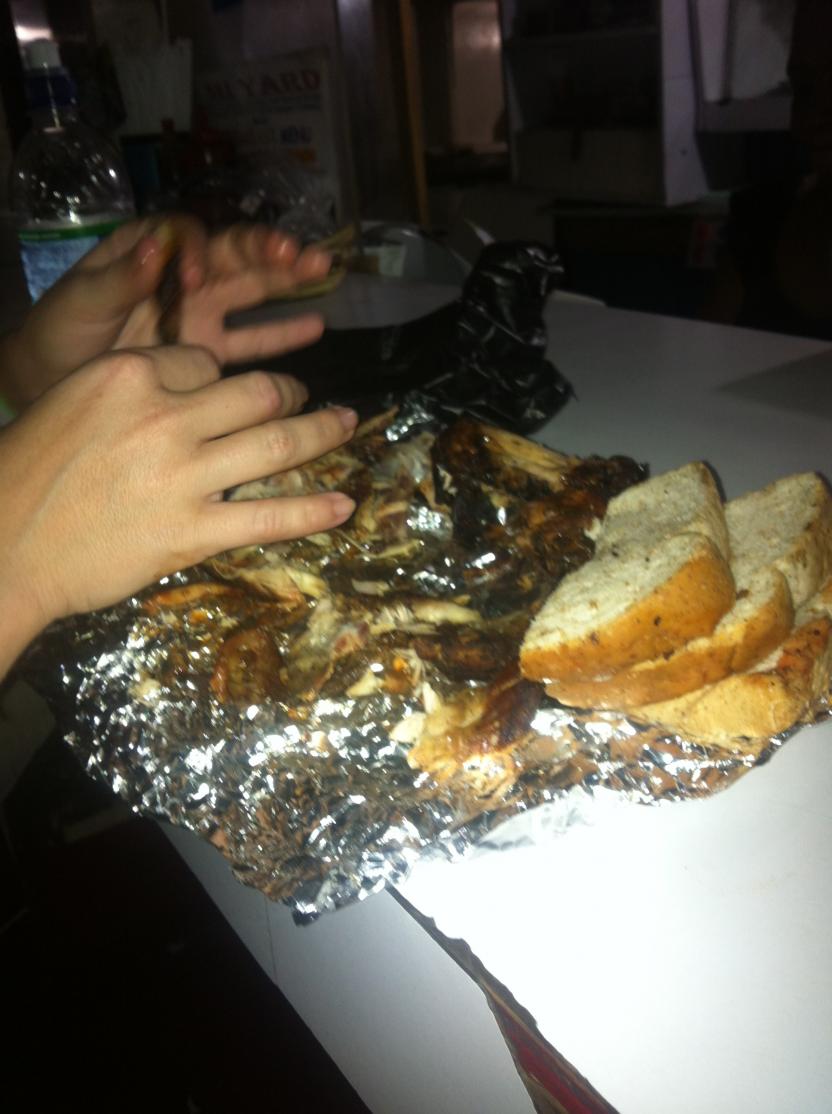 At some point after some crazy assed sh$#, we head out, OH, I forgot about the road "cheekin" I believe it was on the way out of Roots needs a chicken fix so she buys some from a guy out front which I guess was left in the taxi with the wallet? Maybe? I really don't know?