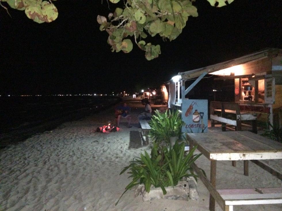 We talked a bit. He told me he needs money to buy his kids food. He invited me behind the juice bar to check out the juicer and DABS. I was drunk but I think DABS is some kind of hash made from oil. Still not positive because the evening is still hazy in my mind. He offered to make me juice, I declined. He showed me various other items that I can't get into here. He kept telling me that he couldn't believe that I wasn't "scared" to hang out with him. He said most tourist would be fearful in the middle of the night. I told him my friend and DH were at the fire and invited him for a beer. We had a couple of beers and jammed and sang by the fire. It was a great time. I wanted to hear more Reggae and invited him to BB and told him I'd buy him another beverage but he said he may be up later but he was tired. I think he went back to sleeping wherever he was sleeping when he popped out of nowhere. DH had a great time jamming on seven mile beach. We had talked about having this moment for the past 2 years so it was great we were actually there living the dream we so often talked about.