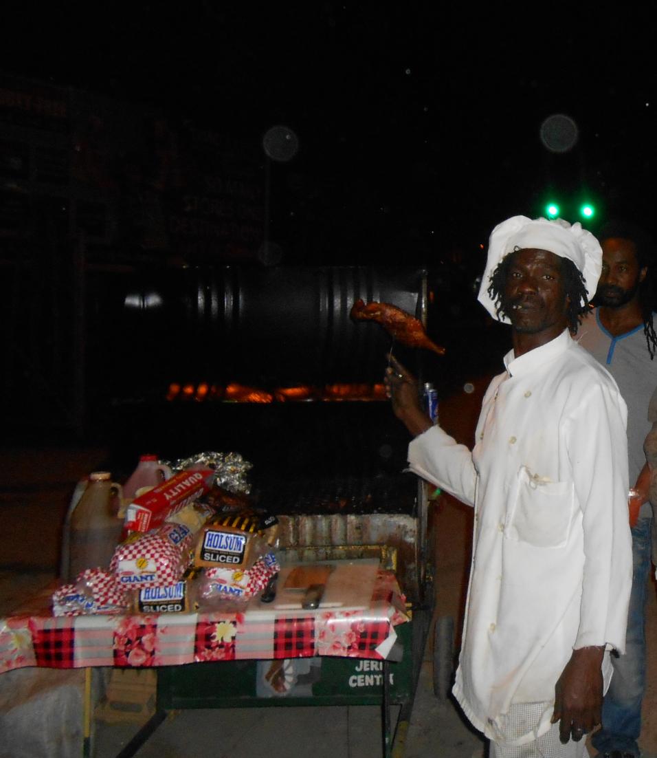 We spent another hour at BB grooving to the beat. I was HUNGRY now. I asked Mr. T where we can eat. He said nothings really open besides the Jerk stands. That sounded perfect to me. I was definitely in no shape to prepare a meal on my own.