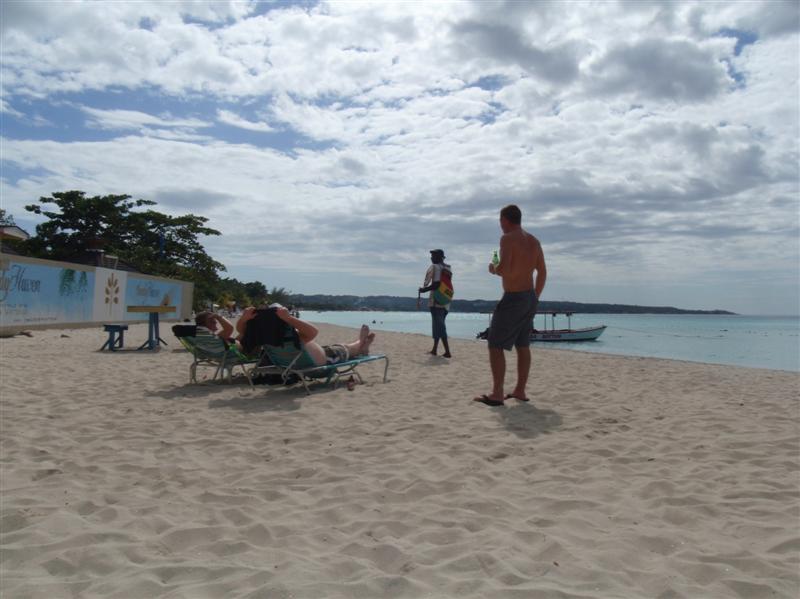 It was an excellent beach day, just lounged around, bought fruit, patties, cotton candy, and jerk pork from vendors for lunch. We got a lot of sun, but no burn. Dennis kept the Red Stripes coming.