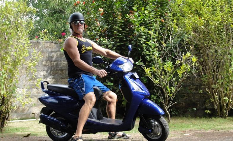Finally - a shot of me 'lookin' dangerous' on my mighty steed (A Honda Pleasure - how's that for danger?)