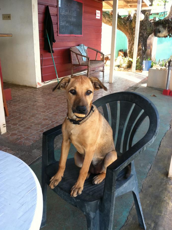 On the large patio between the German Bar and the big building we meet the German Bar dogs, Ganja and Jamaica. Ganja is a sort of scruffy looking dog, Jamaica has the classic look of a Jamaican street dog. Sweetie Pie is ecstatic. Her first accepted biscuit of the week goes to Jamaica. “I know you’re taken care of and these aren’t supposed to be for you but you’re just so cute!” she says.