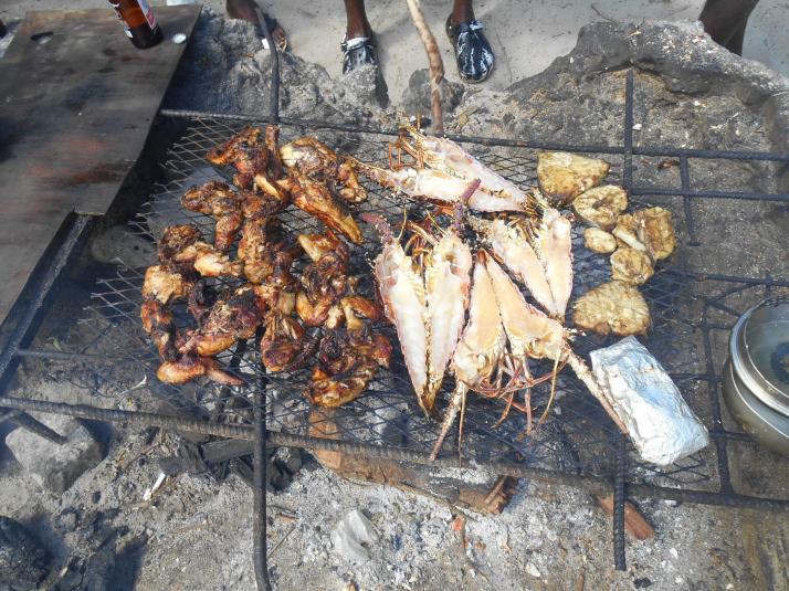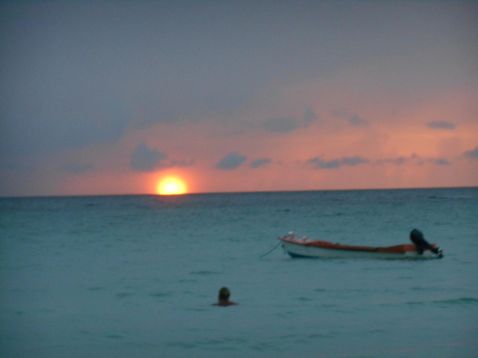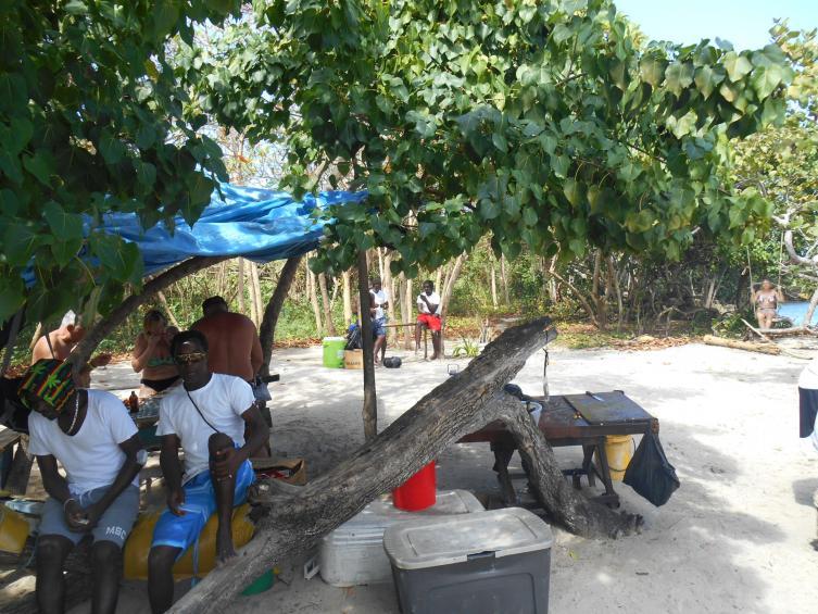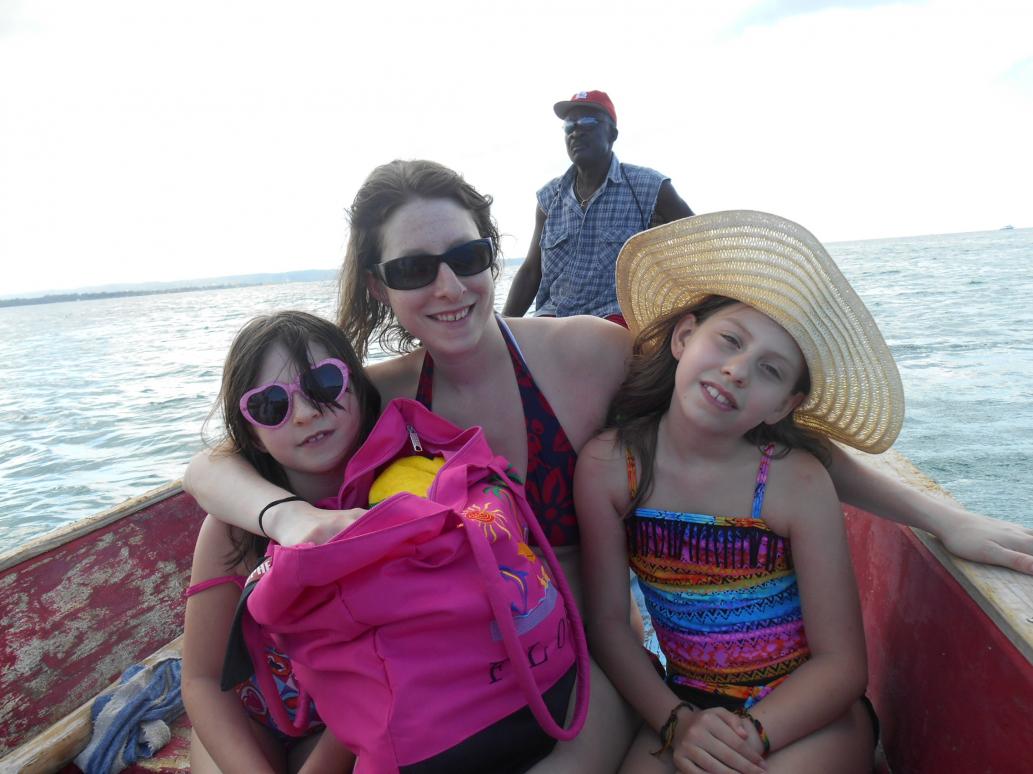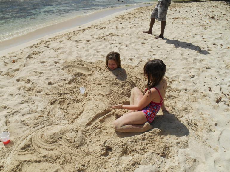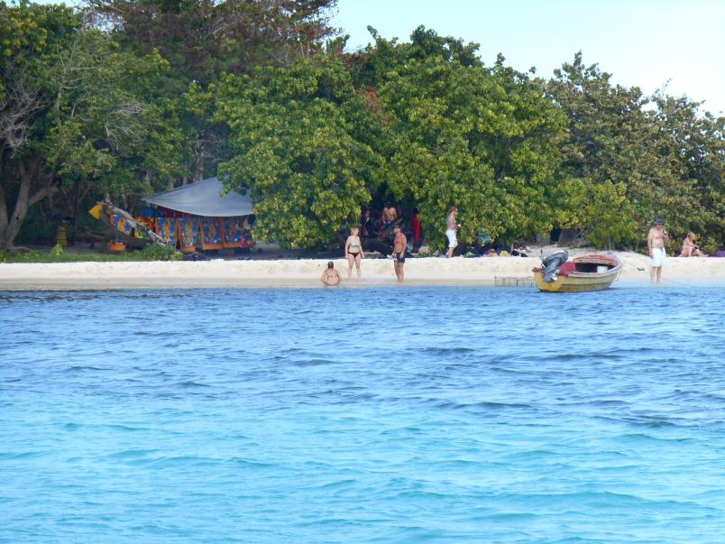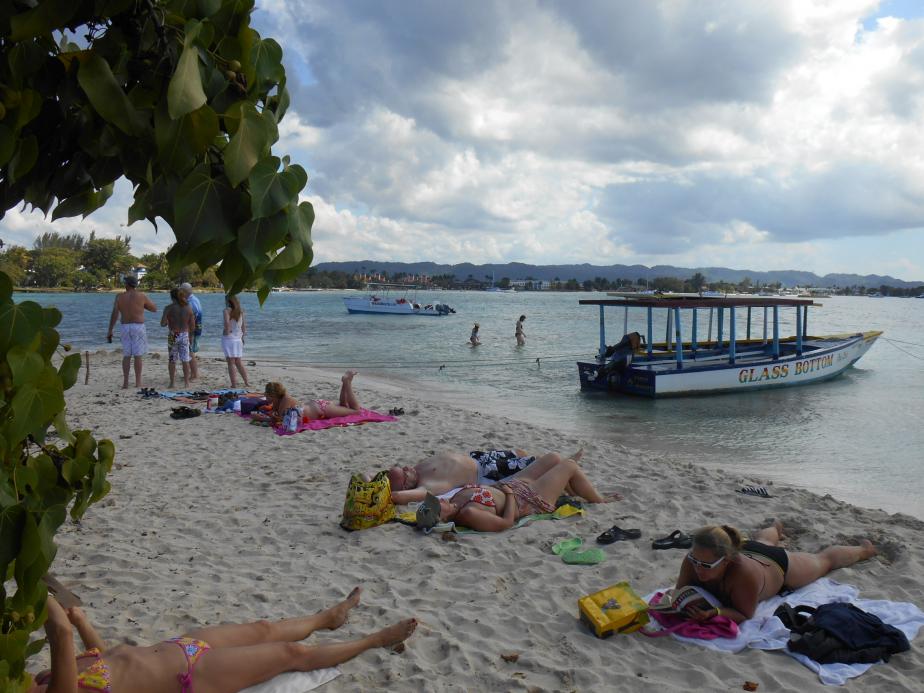 Day 9 - We are all a little worn by this point. The kids have had a busy week and the adults have been going pretty strong as well. We had an answer for this, Ya Mon Red Stripe Catamaran. they picked us up at around 9:30 and brought us up he beach where we got on the boat. Didn't like the next words. "No drinking until after snorkeling". Good thing id brought a big rum punch in my travel mug. This was a nice cruise. slowly down the beach right to the end and than out to the reef. Snorkeling was very good in my opinion. The kids had never done it and as soon as we were in the water we were surrounded by a big school of fish. Lots of colour on the this reef. We even saw squid. That reef needs protecting because there is still a lot of life there. Not as nice as some in Bahamas but nicer that other places ive been. After they took us to the island. Very quaint little sand island. The Fire and grill was going strong. Included was free drinks and jerk chicken or lobster dinner. They had live lobsters in a trap right beside the island and cut it head to toe down the middle. Threw them on the grill while warming the rice/peas and calaloo. You know the lobster is fresh when it still flops around on grill after being cut in half. Food was great. After lunch we sarted cruising the shore slowly but the afternoon rain came in. the woman and children got in the cabin but us guys opted to gut it out. Man did It rain hard. No matter though. At least it was warm.