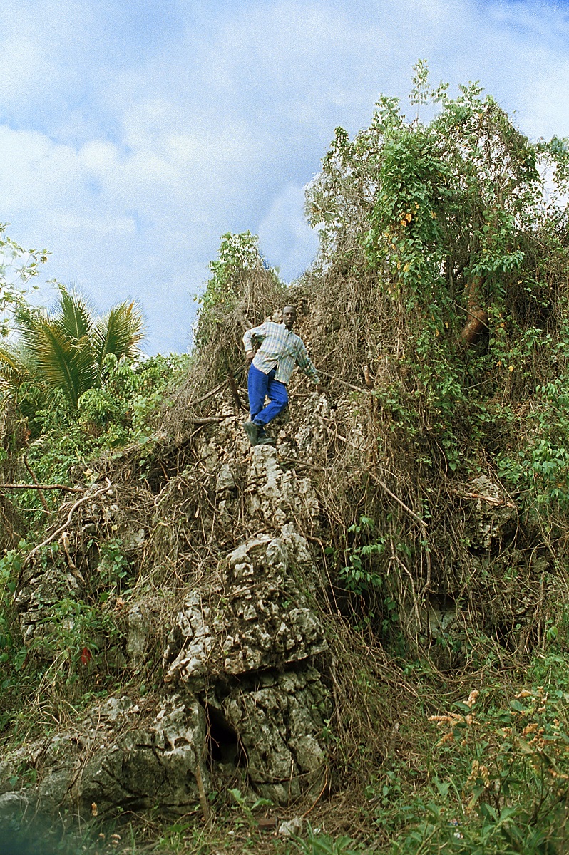On my first hike out into the Cockpits on the way to the Peace Cave where the Treaty to end the Maroon Wars was signed in 1739, took this picture of my best friend "Marshall" climbing the Karst limestone formations.