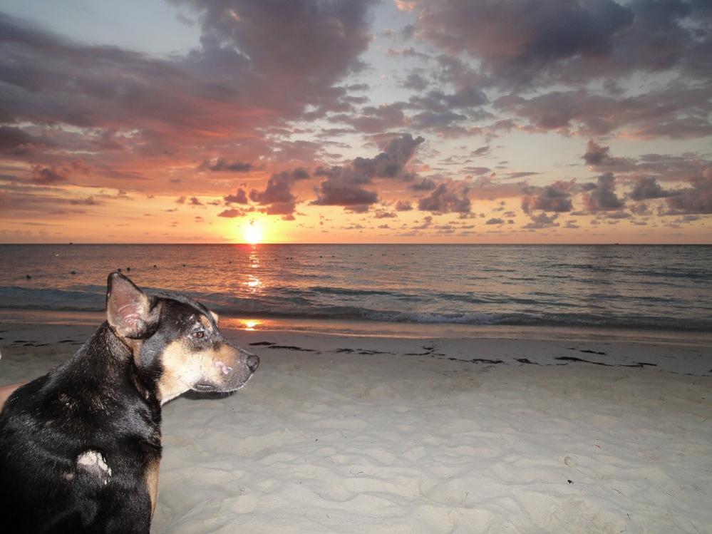 Here is a shot of the dog that adopted us just before sunset. After a brief interlude of scratching the flea-infested mutt behind his mangy ears, Bea went to the room and retrieved the can of cocktail wieners that she had picked up at Value Master just in case such a forlorn hobo should drop by. You should have seen his ears perk up when he heard Bea pull the lid off that can. A beach dog! Wasn’t his first dinner from a can, obviously. Anyhow, at the ripping of the top he got excited as a fat boy walking into a candy store.