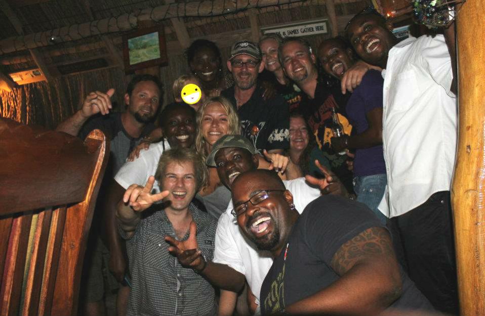 They both take those shots like pros and then some other antics ensue from the staff at Catcha to help Vevienne celebrate her birthday and with that we all have a good laugh. The staff there is the best! As the night is coming to a close we also realize that this will be the last night this whole group is together as tomorrow Booger, Pooper, Tizzy and Gonjon will be returning home. So we decide we need to take some sort of group shot and there would be no better place to take it than at Ivan’s bar. Tizzy points out a sign in the bar and says that would be the best place for us all to gather for the group shot. So we all move to the area and after a long and elaborate camera positioning, testing and setup process we capture the group shot under the sign that reads “Friends and Family Gather Here”