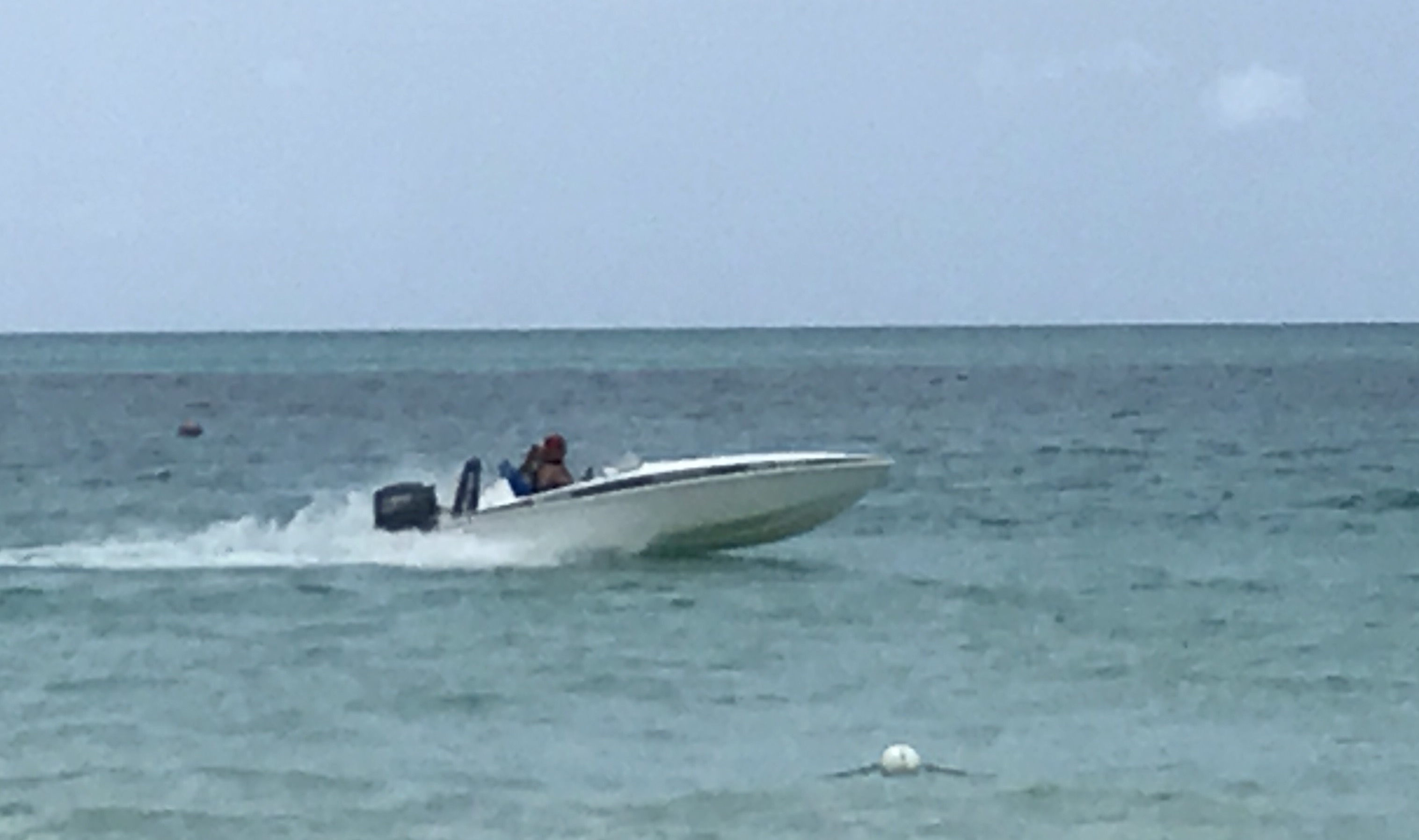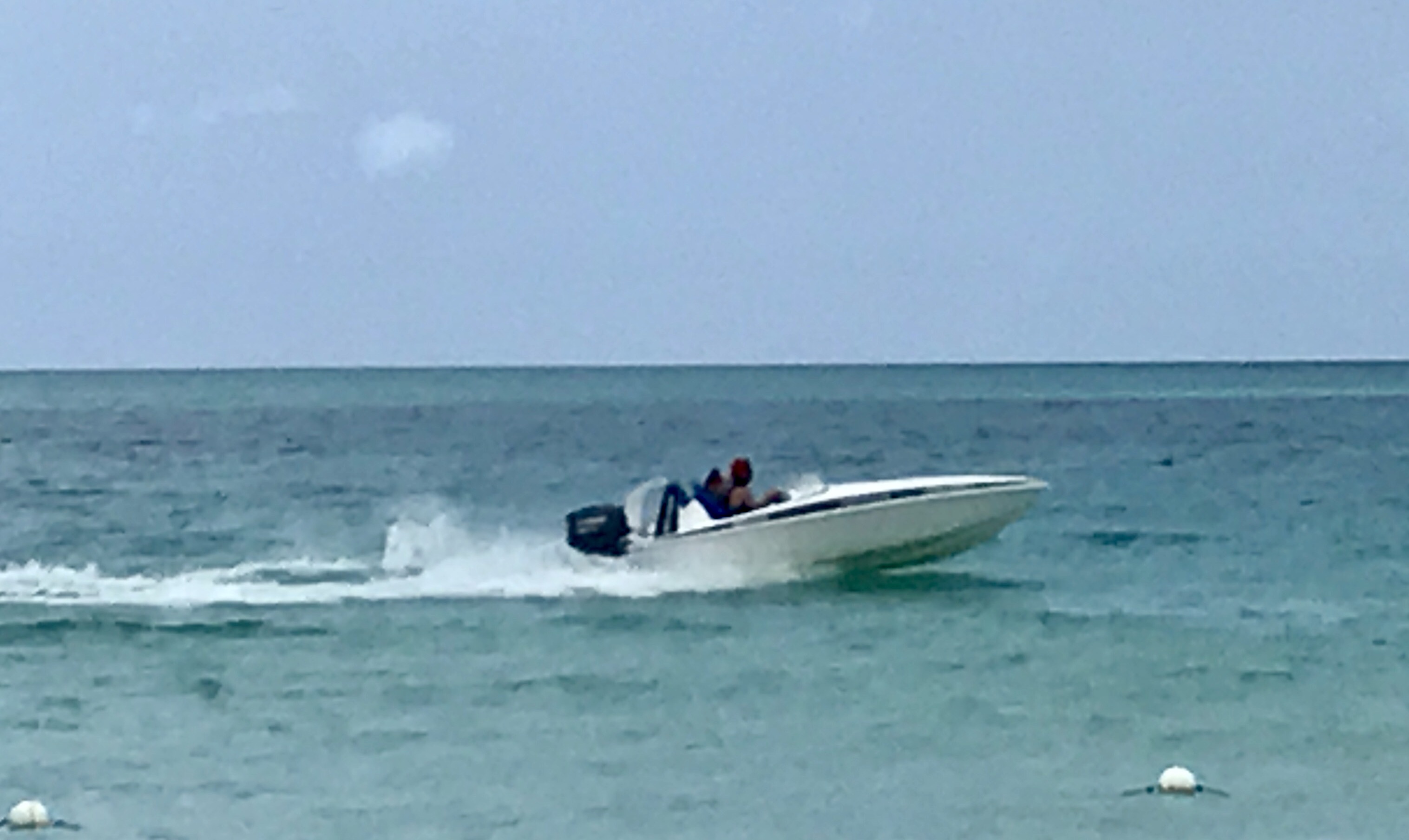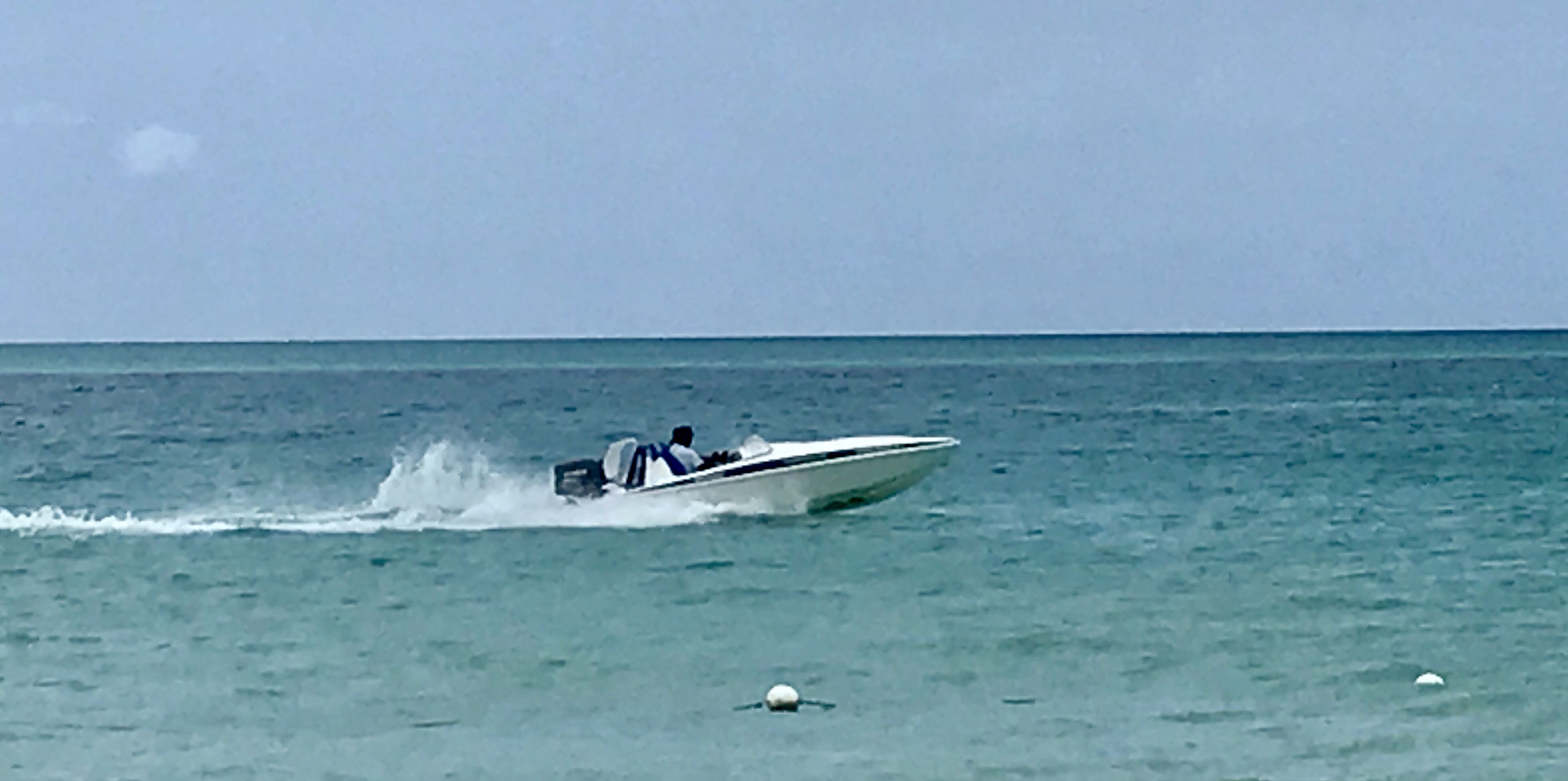 This horse may be dead, but I took some photos last week. The boats came by daily, and it was always the same, there were either two or three speedboats, Jamaicans always in lead boats and white tourists in the one or two boats following. It was clear and sometimes one of the Jamaicans would sit backwards like a ski spotter watching the tourist boat. They came by daily at least once. I also saw the boats once up around Canoe bar.