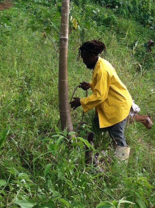 There are other crops to look after as well. Two in particular are Sorrel and Yams. Sorrel ripens around Christmas so it is a traditional Christmas drink. We strip the buds off the sorrel and put them out to dry in the sun. Once dry, they store quite well and can be put into boiling water whenever you want to use them. The yams are of various species; we have Renta Yams, Yellow Yams, Lucy Yams as well as two wild growing yams called Bitter Gashie and Imba Yams.